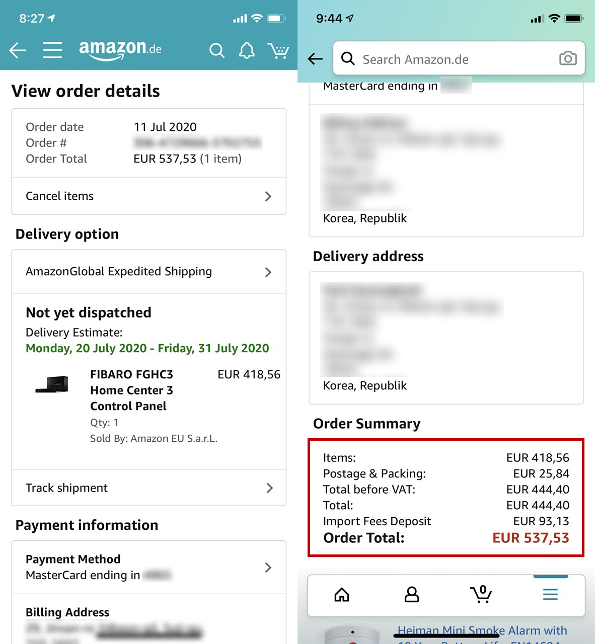 배송비(25.84 유로)와 관부가세 보증금(93.13 유로)을 더하여 537.53 유로를 한방에 결제하였다.