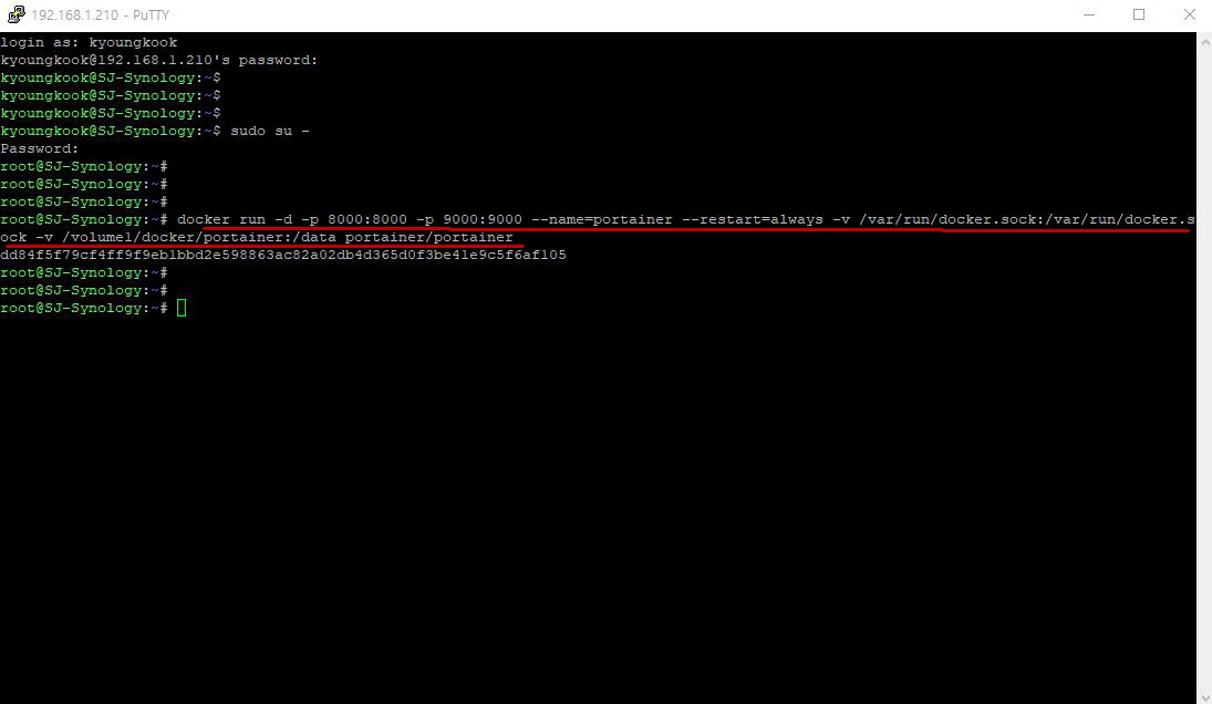 2) PuTTY 또는 SSH로 시놀로지에 로그인하여 루트 계정($sudo su - )으로 전환