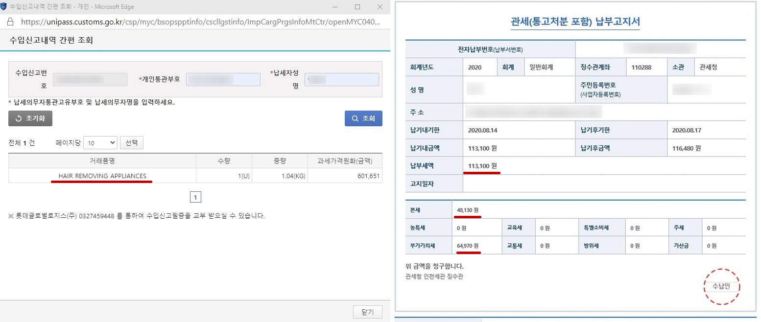 HC3의 거래품명이 'Hair Removing Appliance'로 엉뚱하게 입력되어, 관세 8%와 부가세 10%로 잘 못 부과되어 있어서,