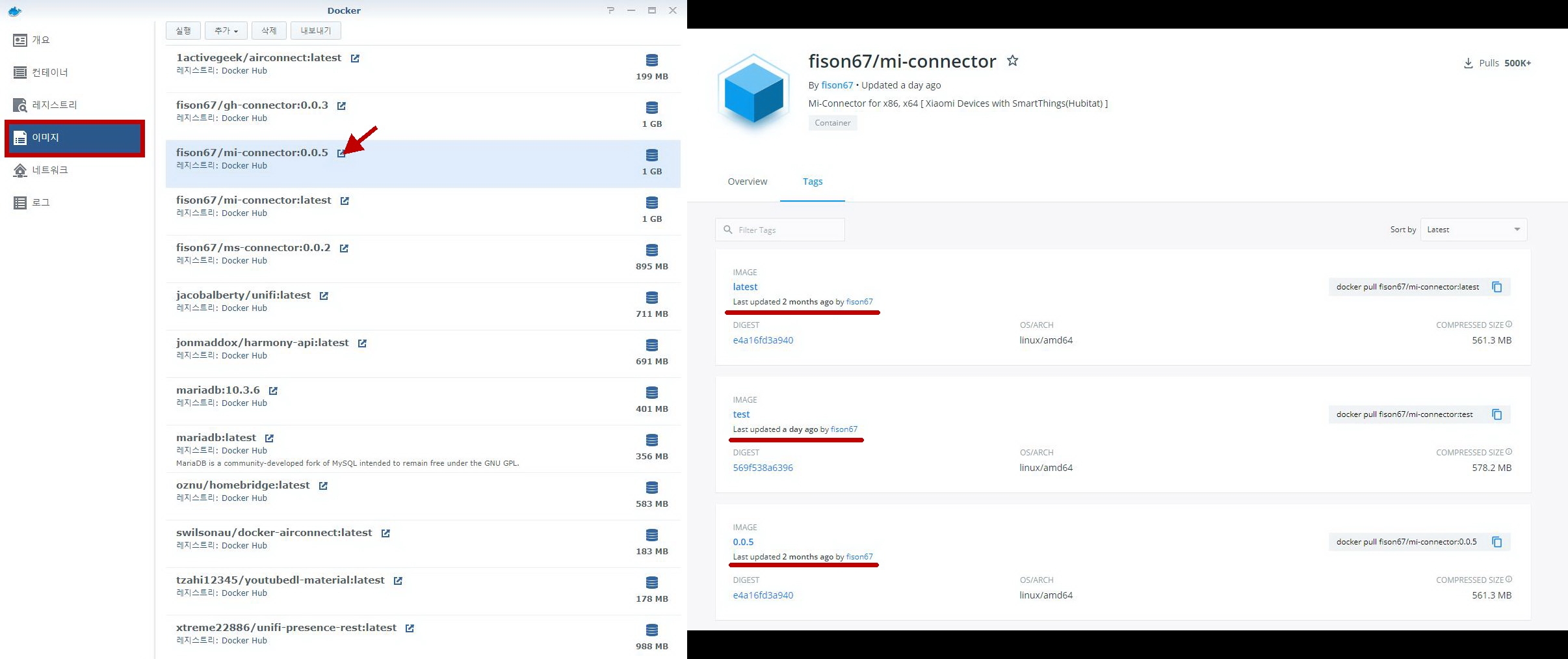 참고로 미 커넥터 도커 컨테이너는 최신 버전과 0.0.5 버전이 동일하다.