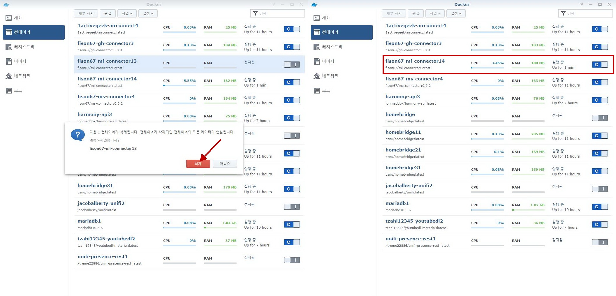 新컨테이너(mi-connector15)를 시작하고, 舊컨테이너(mi-connector14)의 우측 마우스를 클릭하여 [작업->삭제]한다.