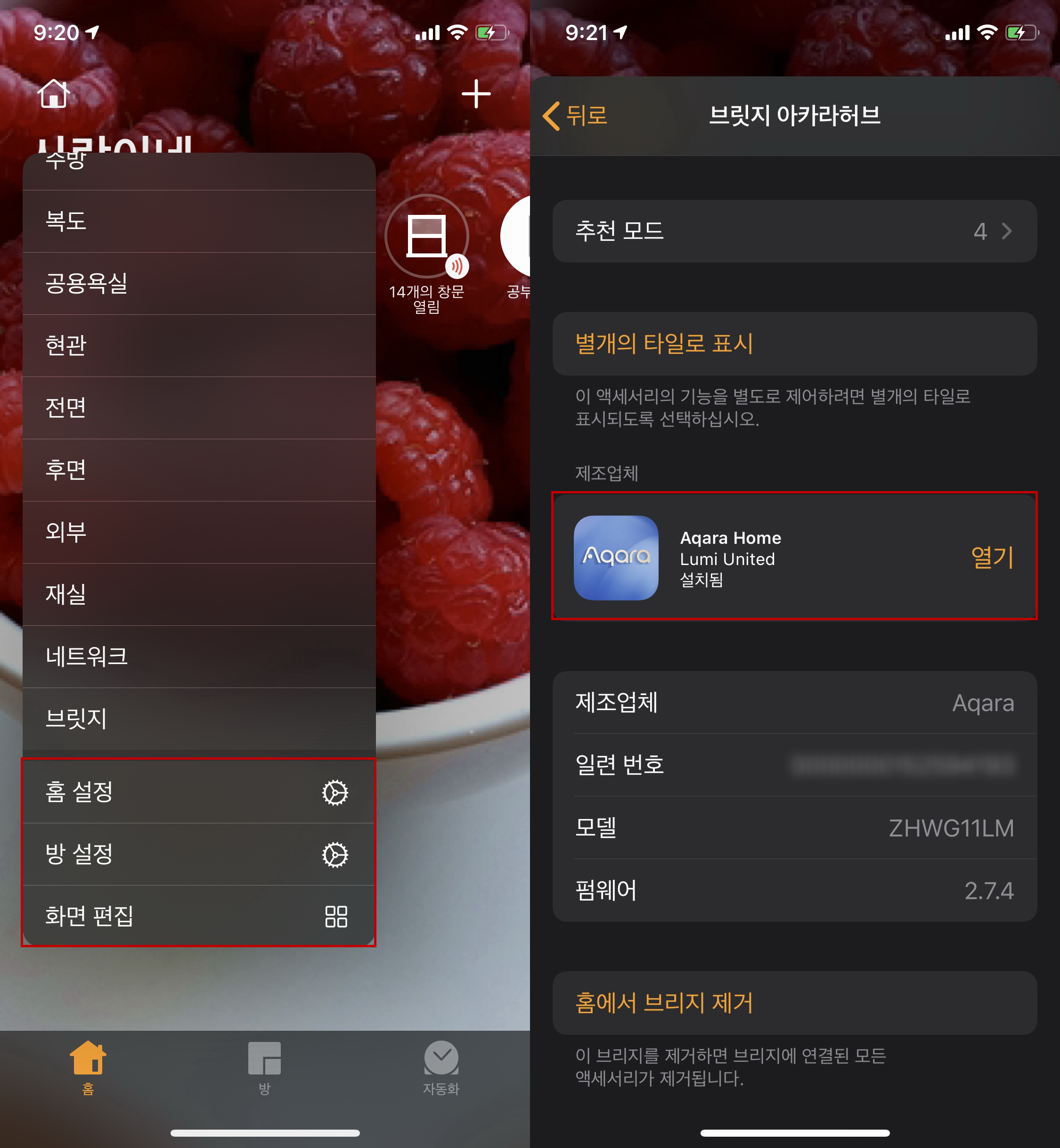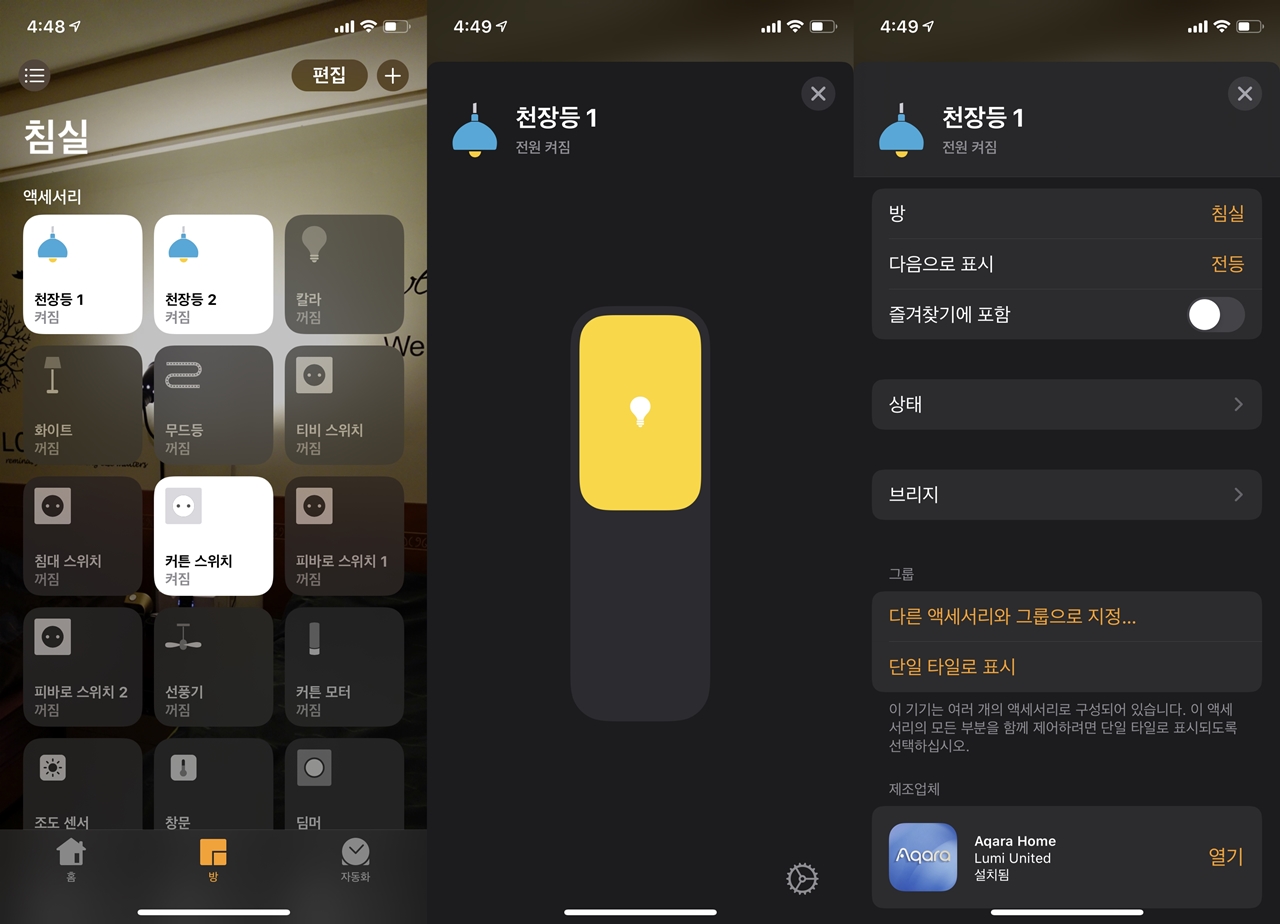 한 놈은 침실에 아카라 허브에 연결하여 애플 홈킷에 직결하도록 설치하였고,