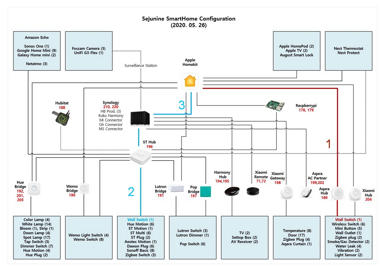 파란색 2번이 스마트싱스 허브에 연결, 3번이 홈브릿지를 통한 홈킷에 연결한 경로이다.