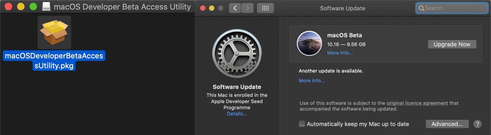 베타 버전 설치는 베타 프로파일 사이트( https://betaprofiles.com/ )에서 pkg파일을 내려받아 설치하고,