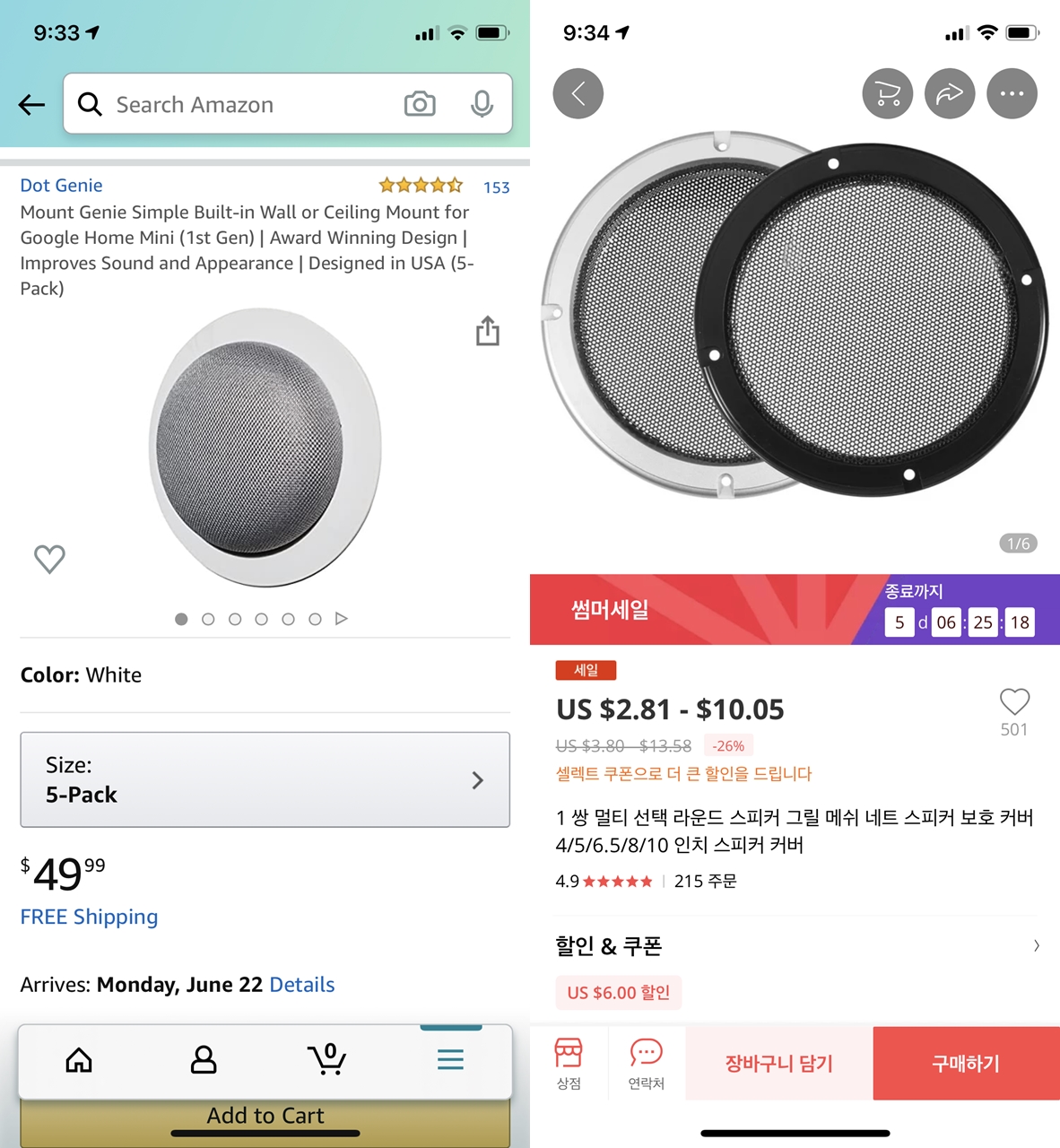 갤럭시 홈 미니의 천장 매립을 위하여 스피커 그릴 2세트도 6.62달러에 구매하였다.