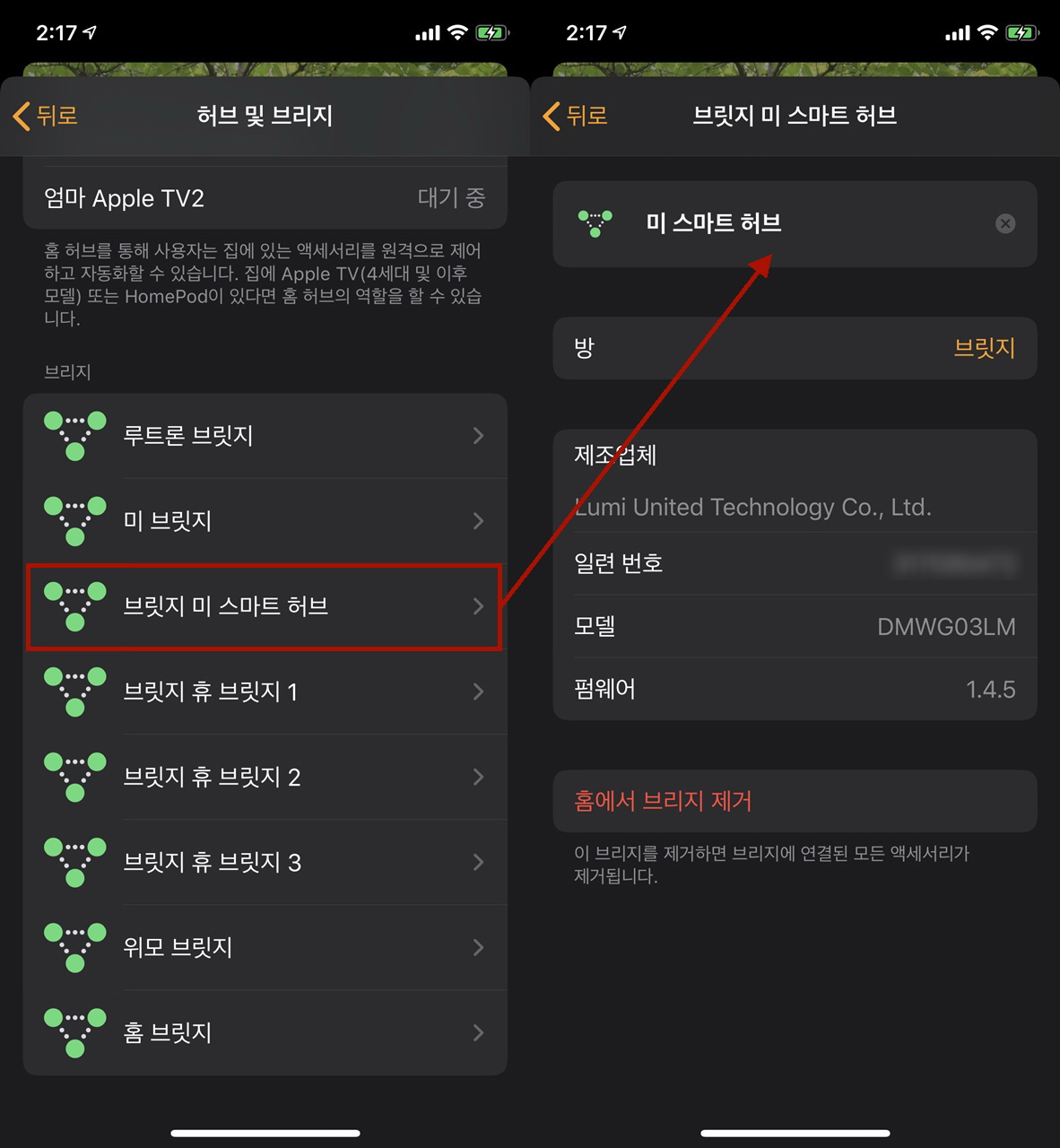 홈킷은 아카라 허브와는 다르게 홈앱의 '허브 및 브리지' 메뉴에 잘 배치가 되더라.