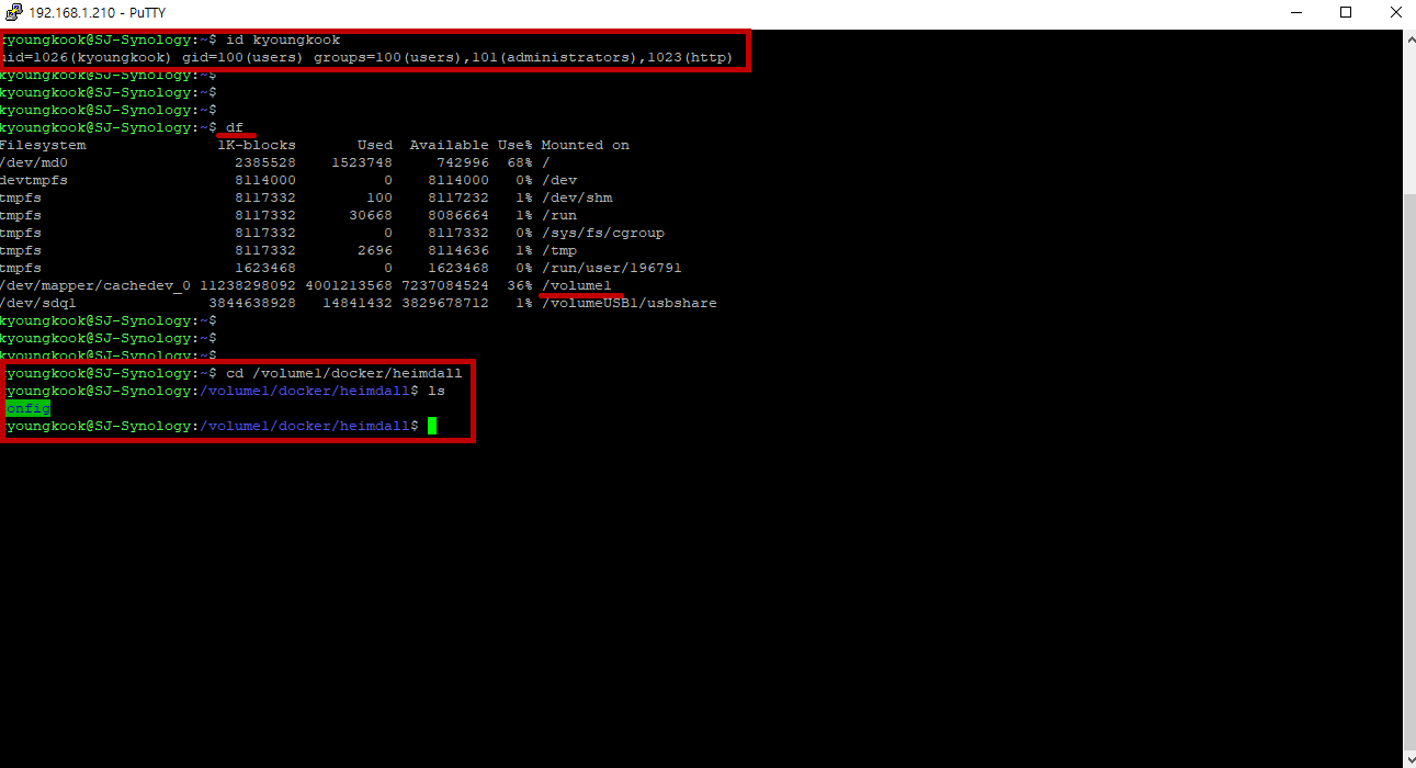 4) putty로 시놀로지에 로그인하여 "id" 명령어로 uid와 gid를 획득하고, "df" 명령어로 절대 경로 볼륨(/volume1)을 확인