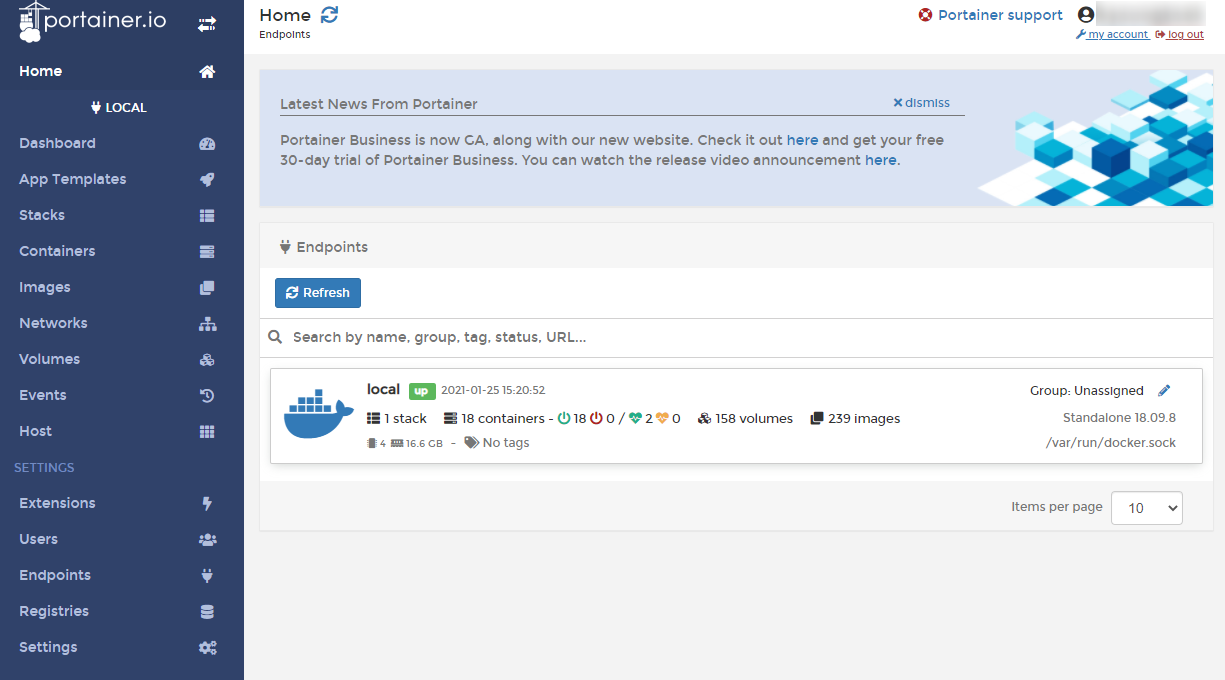 6) 포테이너에 로그인하여 좌측 슬라이드바의 'Stacks'를 클릭 후 '+ Add Stack'을 누르고,