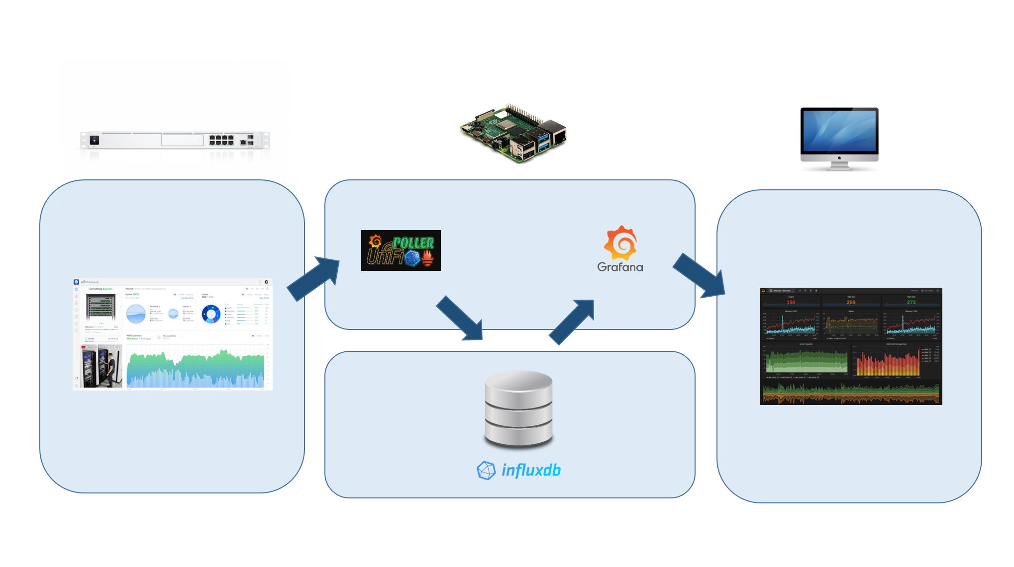 UniFi-Poller가 UniFi Controller에서 자료를 읽어 InfluxDB에 저장하고,