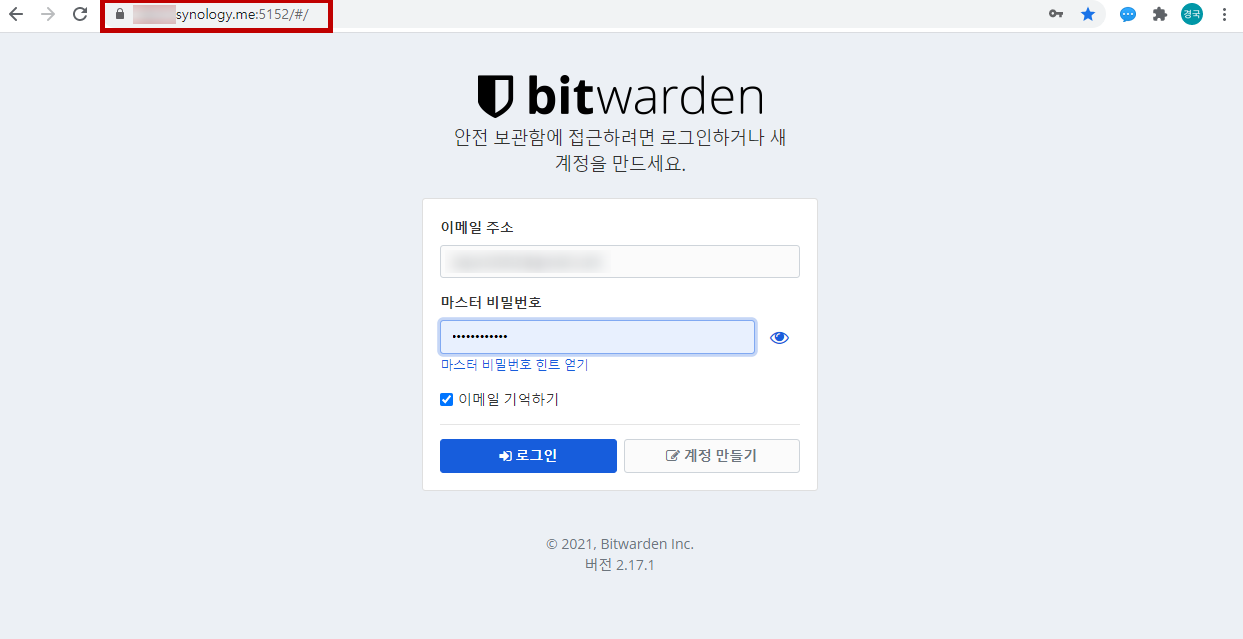 웹 브라우저 창에 "http://synology-ip:5151"을 입력하면 bitwarden 로그인 화면은 뜨나,
