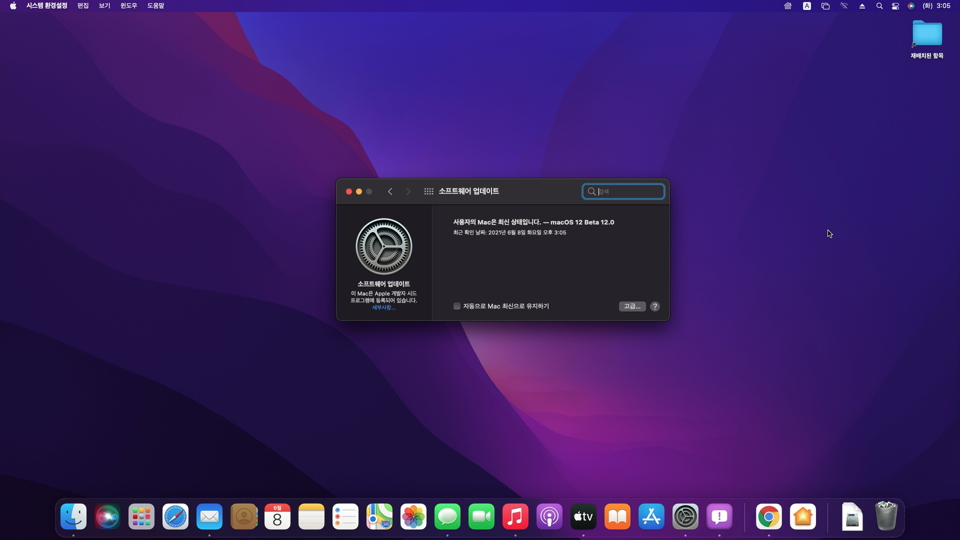 맥은 macOS 11을 사용하고 있었다면, '설정-소프트웨어 업데이트'를 클릭하면 자동으로 macOS 12로 업그레이드 진행