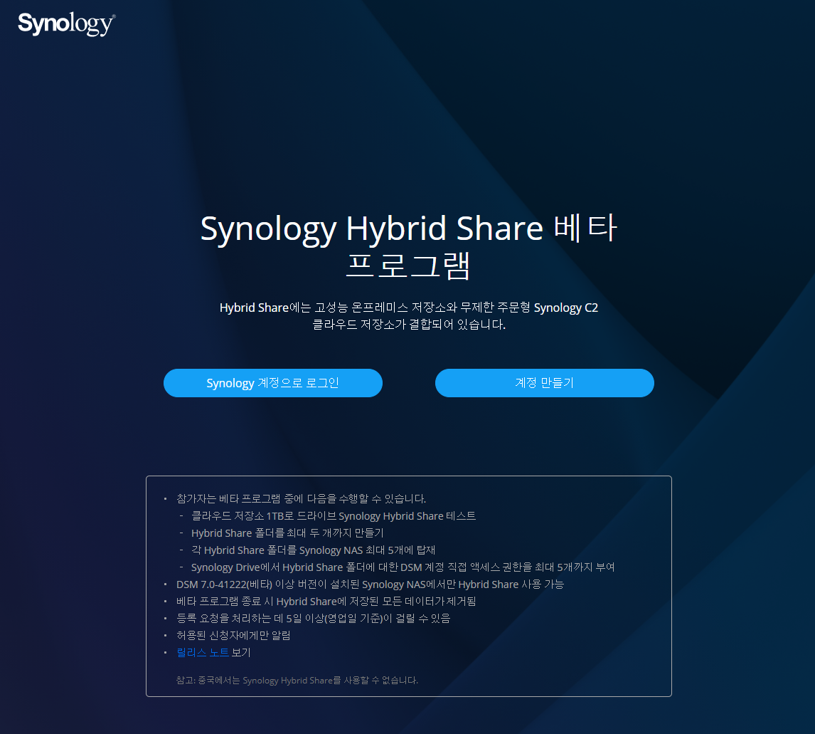 아직은 베타 서비스라서 기존 시놀로지 계정으로 베타 프로그램 등록을 하고서,