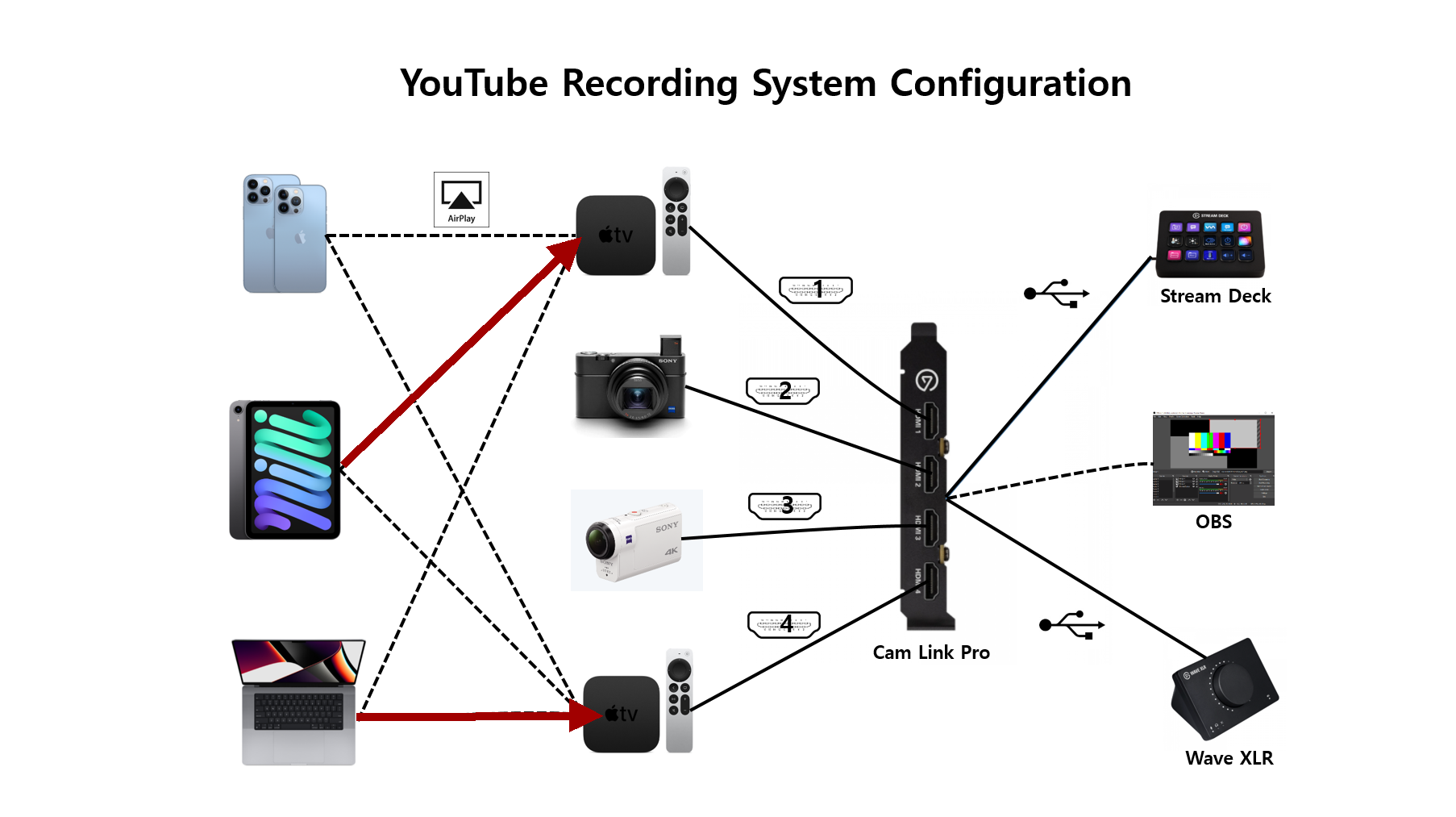 Cam Link Pro엔 애플티비 2호기, 메인 카메라, 보조 카메라, 애플티비 1호기가 각각 HDMI로 연결되고,