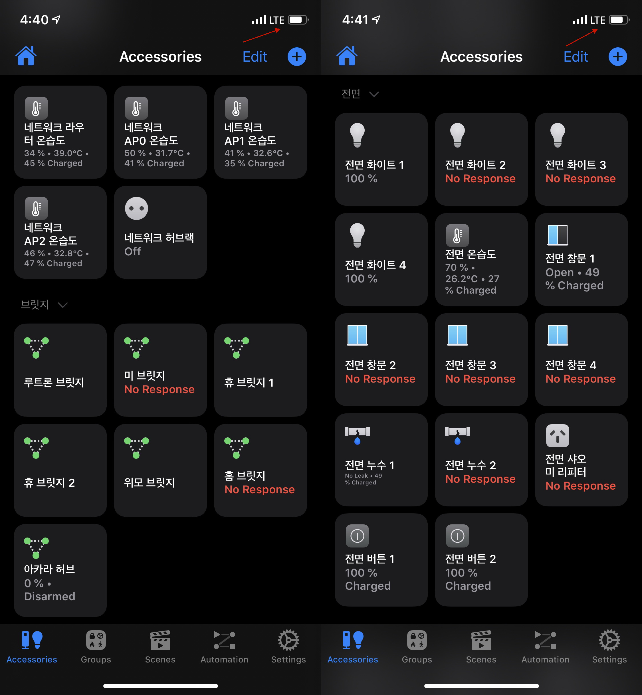 결정적으로 원격(LTE 모드)에서는 홈브릿지의 일부 액세서리들이 '응답없음'으로 빠지는 문제가 있었다.
