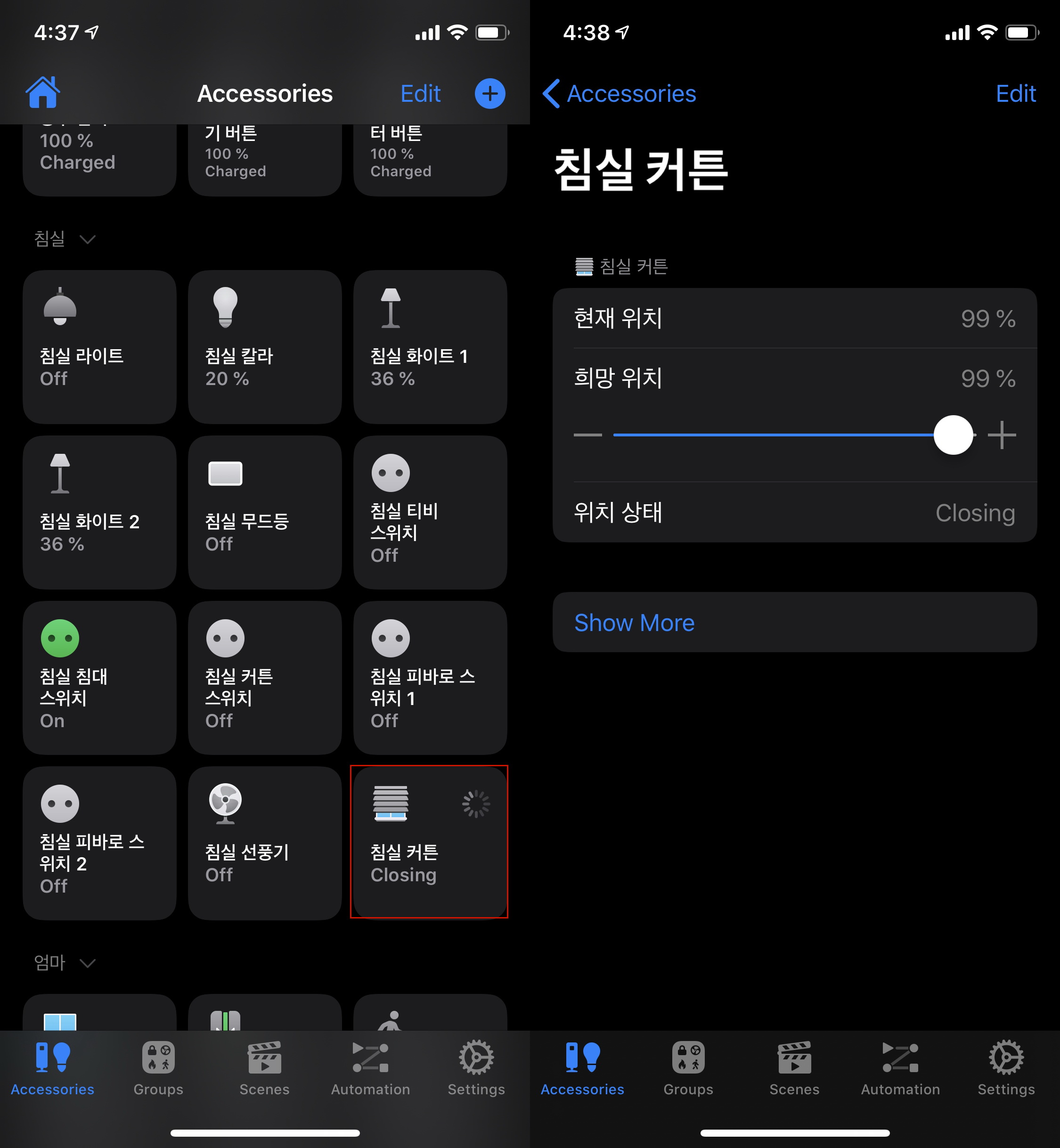 그리고 오리지널 홈앱에서는 액세서리 그룹을 1개의 타일로 표현이 가능했으나,