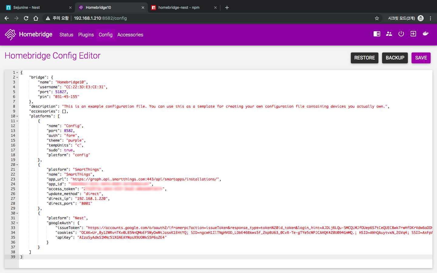 그리고 위에서 획득한 "issueToken", "cookies", "apikey" 3개 항목을 홈브릿지 config.json에 복사하여 저장하고,