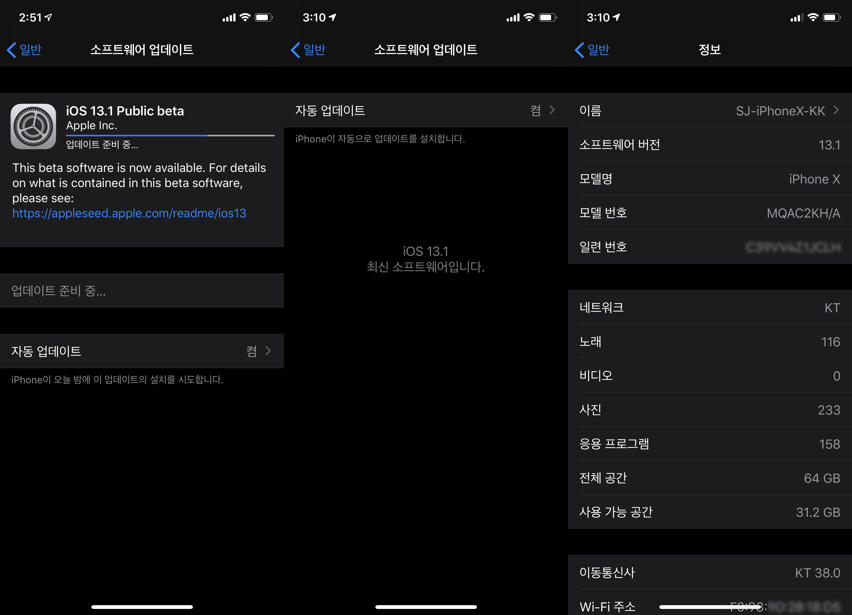 침대에 누워서 스마트폰을 만지작거리다 iOS 13.1 퍼블릭 베타가 릴리즈 되었길래 업데이트를 하였다.