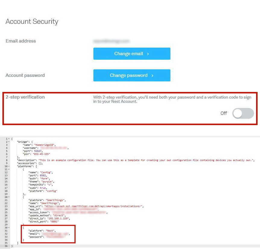 네스트 계정에서 2단계 인증은 Off 하시고, config.json에서 pin은 사용하지 마세요.