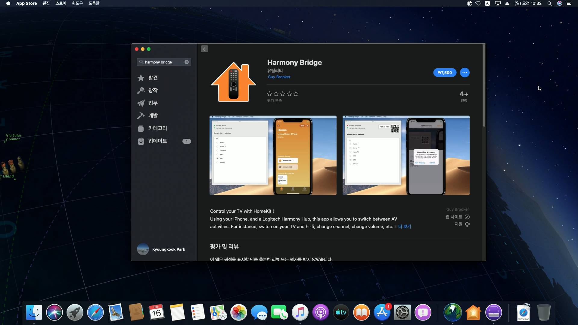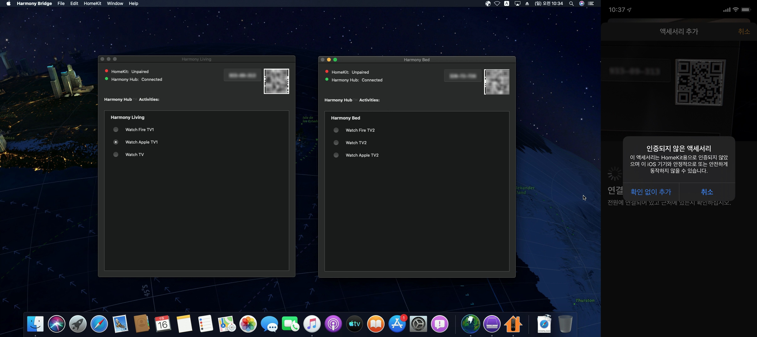 설치는 Mac에서 유료인 어플을 다운로드하여 인스톨하고, 홈앱의 액세서리 추가에서 QR코드만 찍으면,