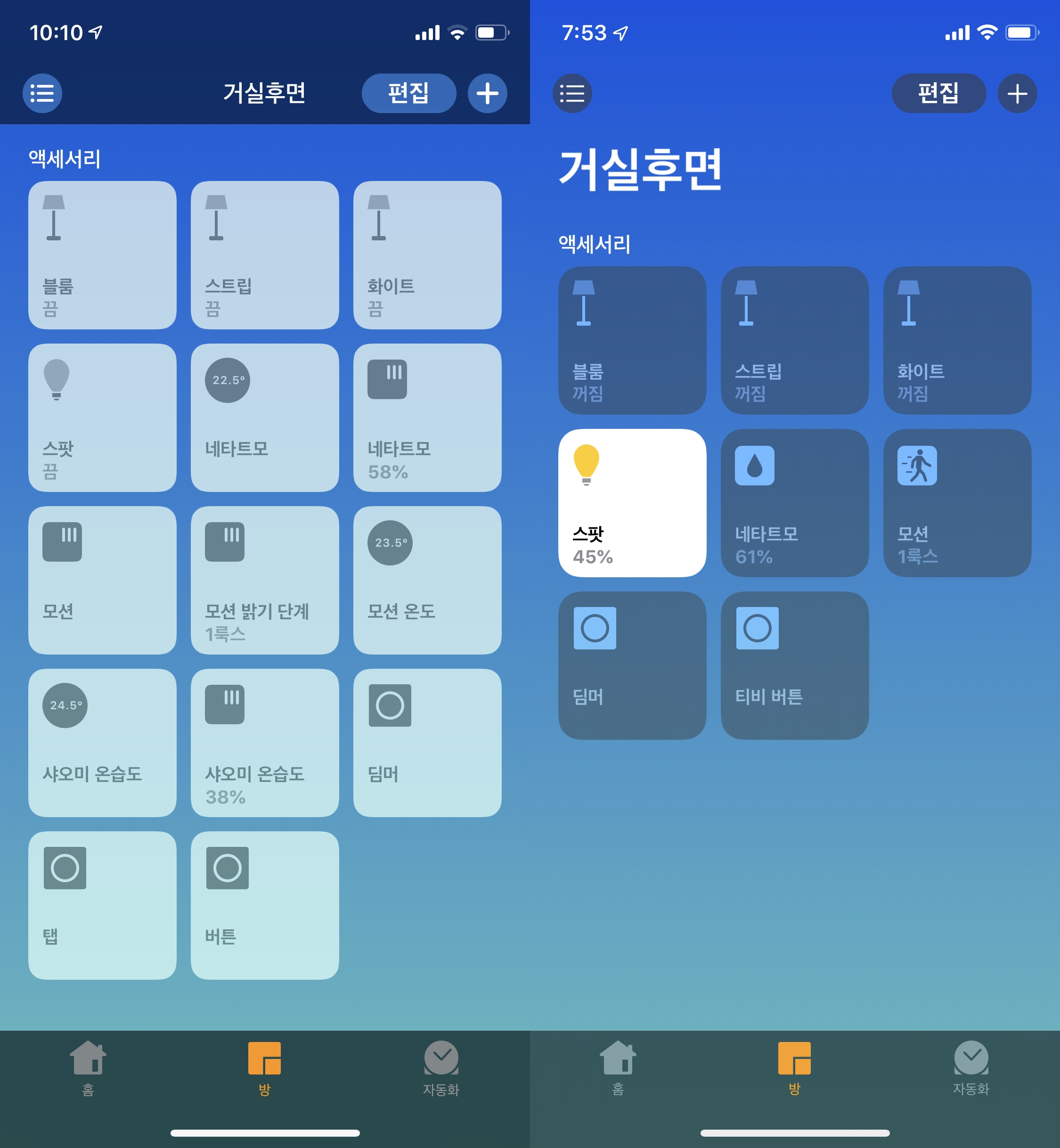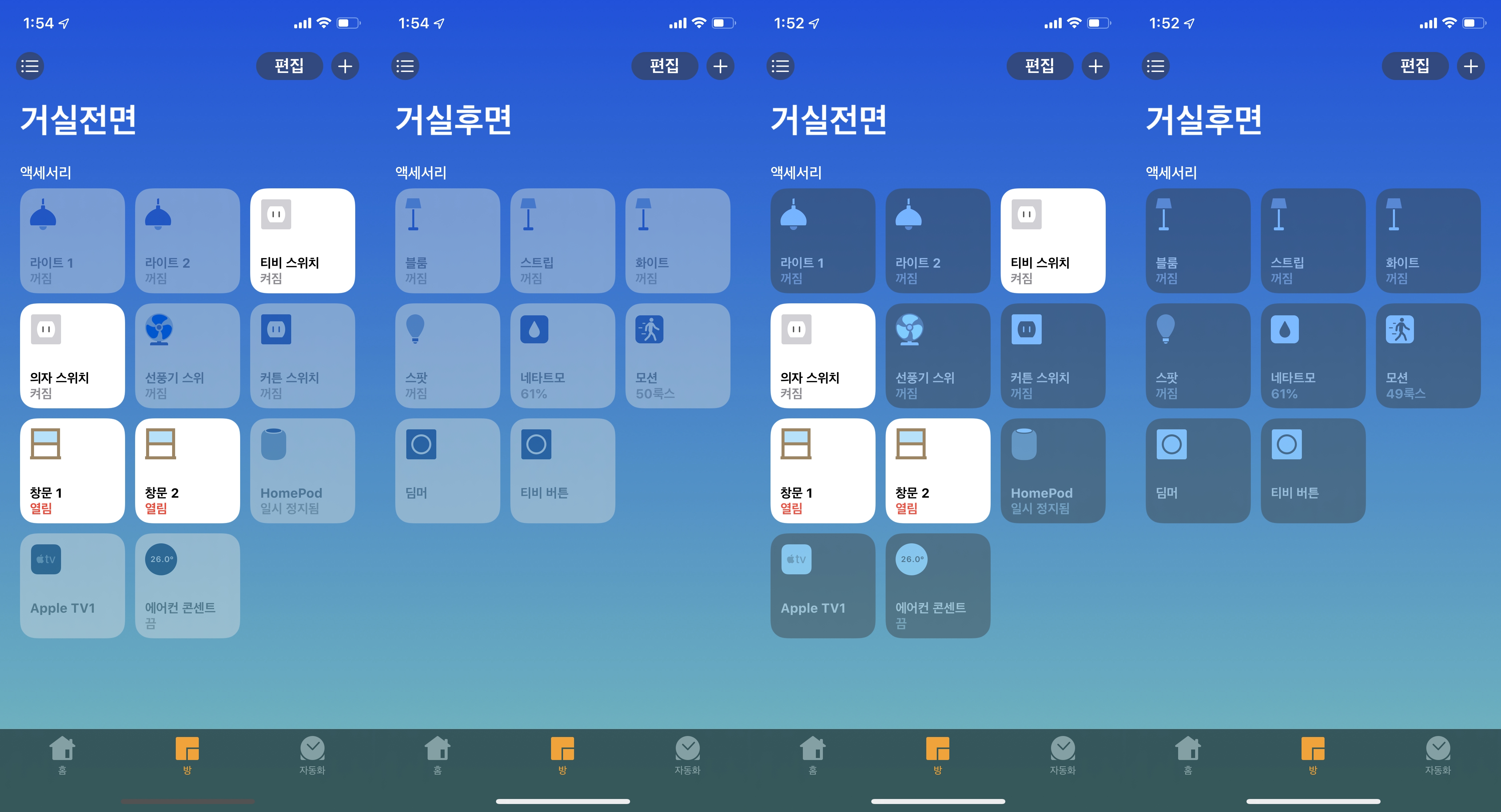 오늘은 심심해서 iOS 13 홈킷의 라이트 모드와 다크 모드의 가독성을 간단하게 비교해 보았다.
