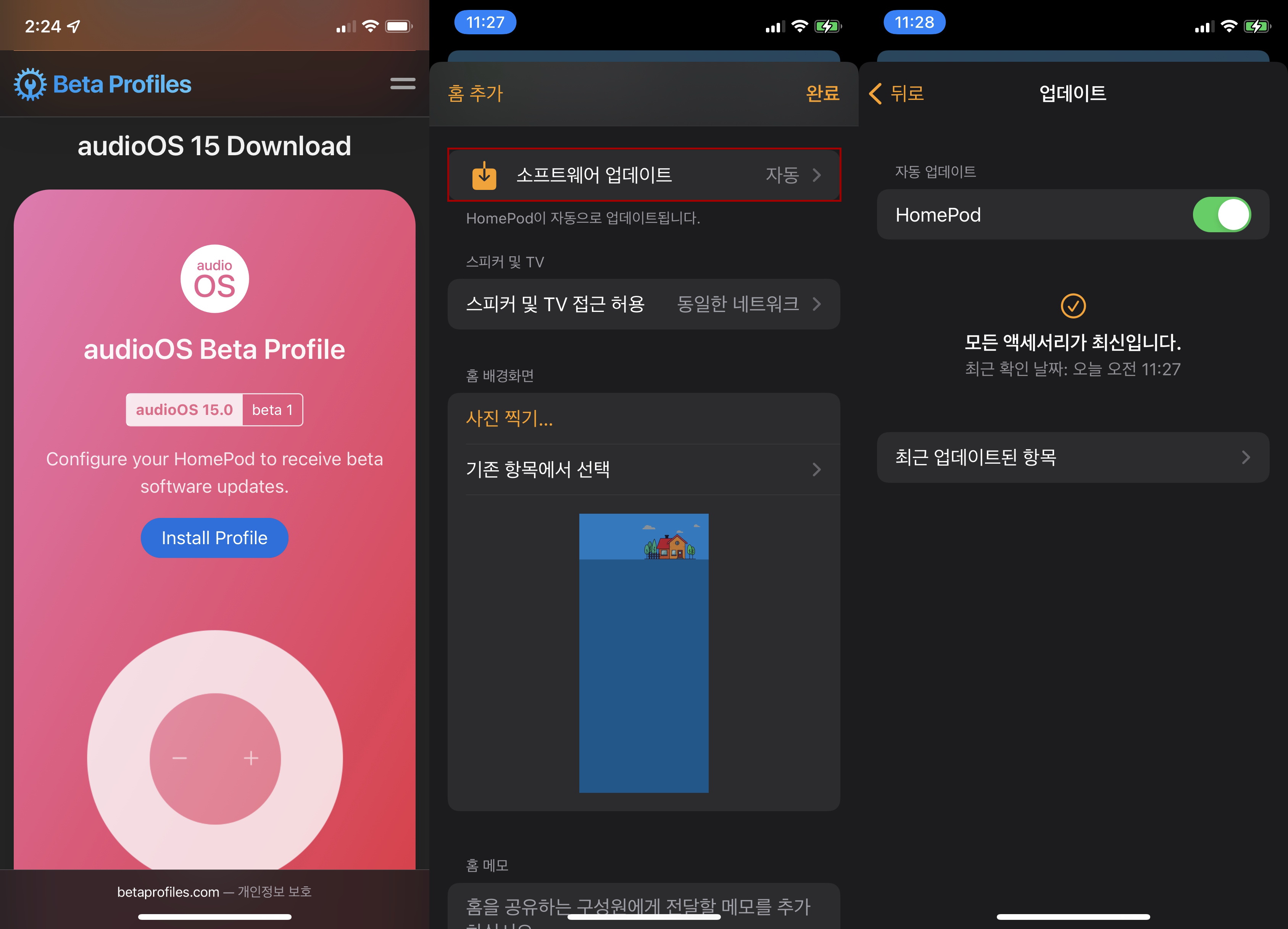 2) Beta Profiles 사이트에서 'audioOS 15.0 beta 1' 프로파일을 홈팟에 각각 설치