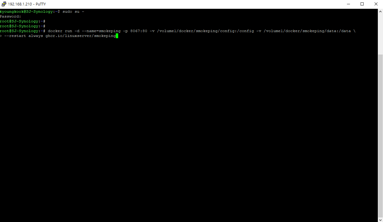 PuTTy로 시놀로지 ssh에 root계정으로 로그인후, 위의 코드 블럭을 복붙하여 실행하면 도커 컨테이너가 자동으로 생성된다.