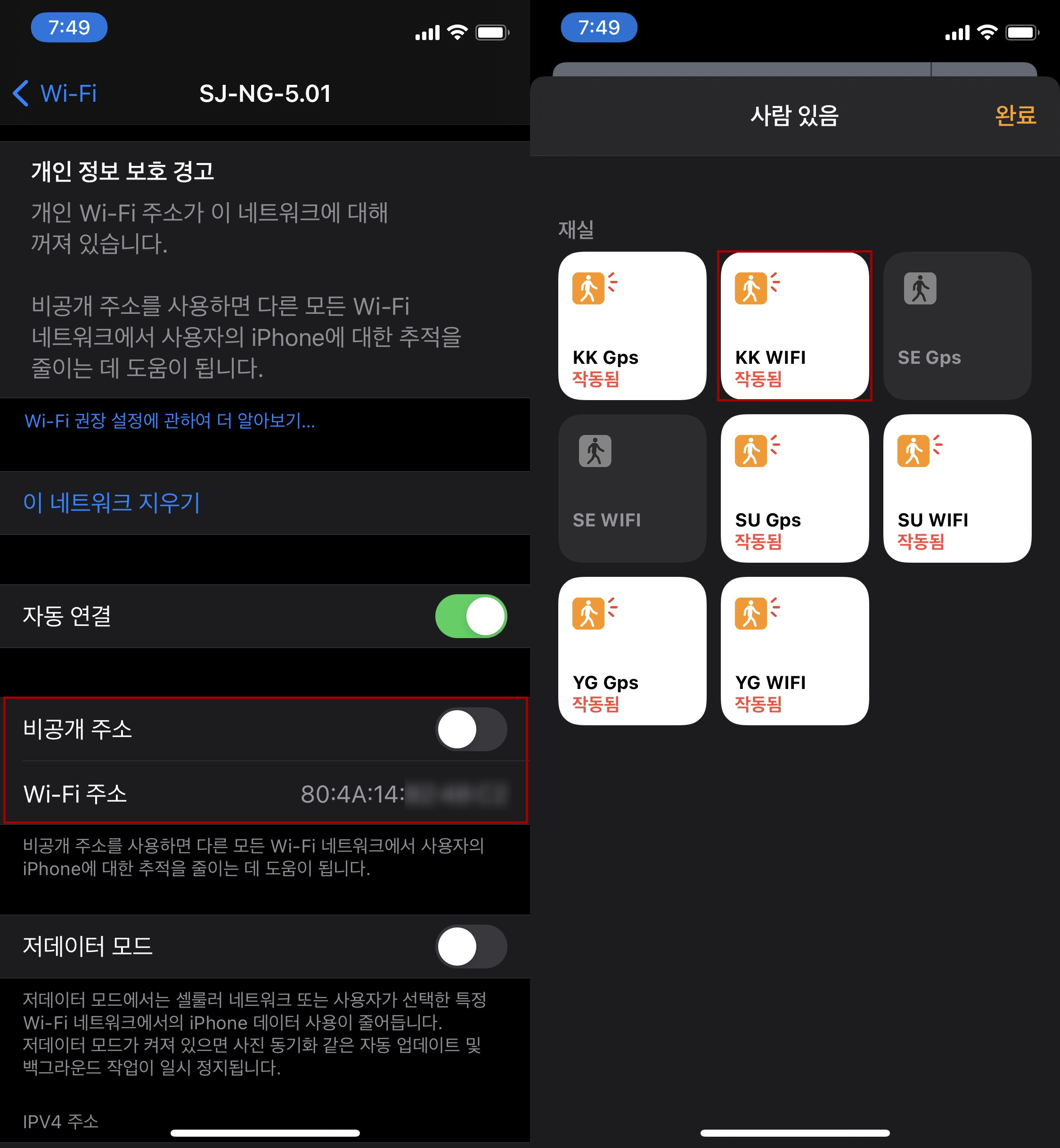 자동 연결되는 집안 SSID에 비공개 주소를 반드시 비활성(Disable)시키자.