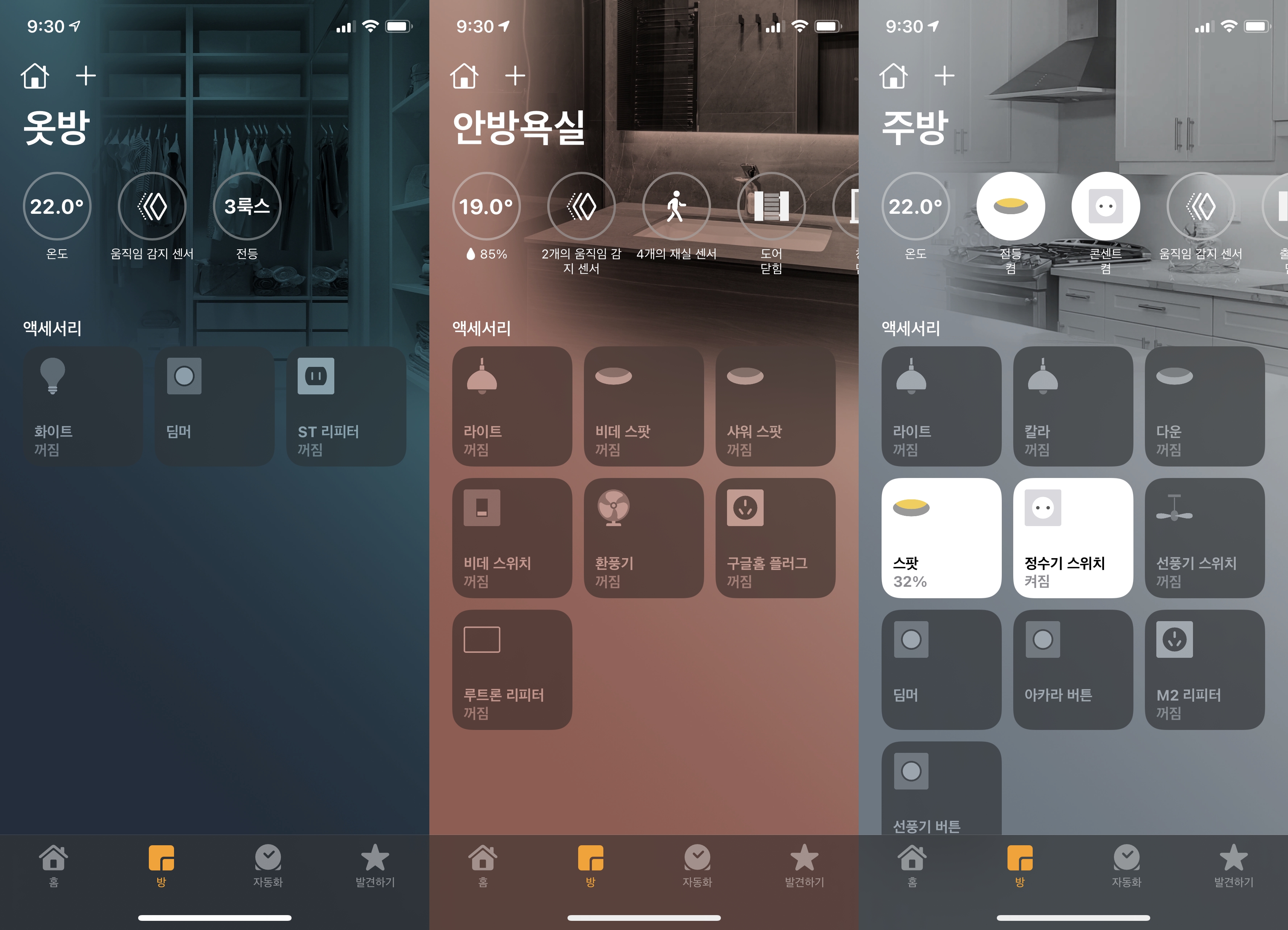 애플 홈앱의 '방 설정-방 배경화면'에서 하나하나 노가다스럽게 바꾸면 된다.