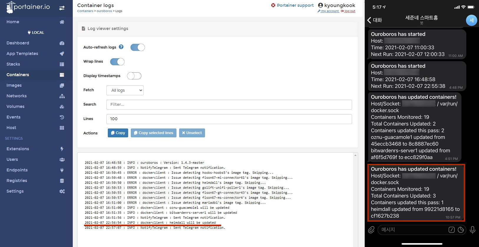어젯밤에 Heimdall 컨테이너가 자동으로 업데이트가 되어서,