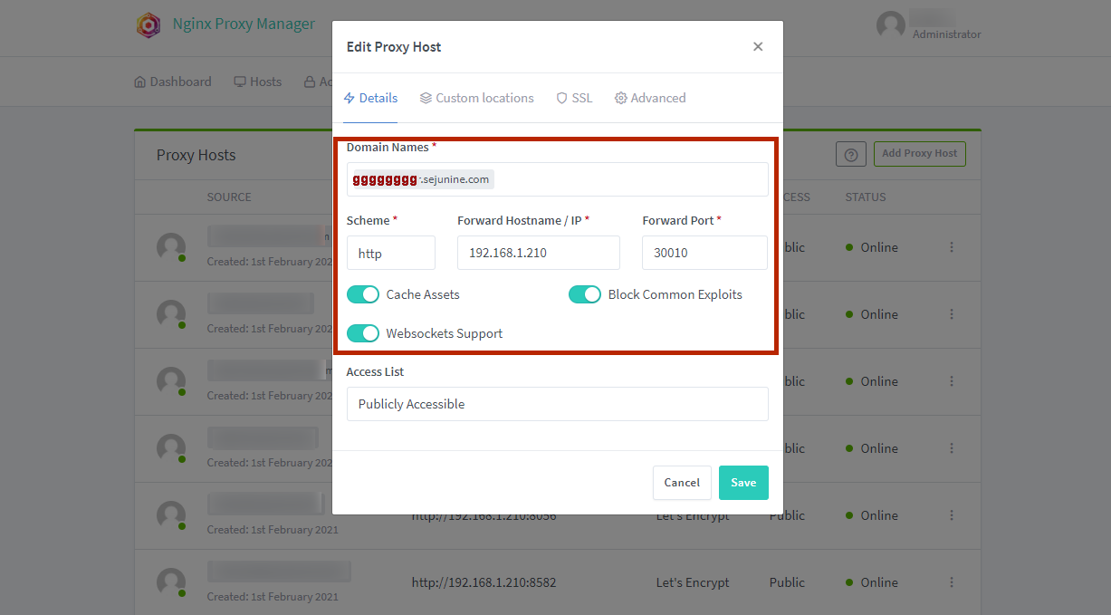 NPM에 접속(http://synology-ip:8181)하여 Hosts 탭에서 "Domain Names, Scheme, IP, Port" 입력과 옵션 3개를 체크하고,