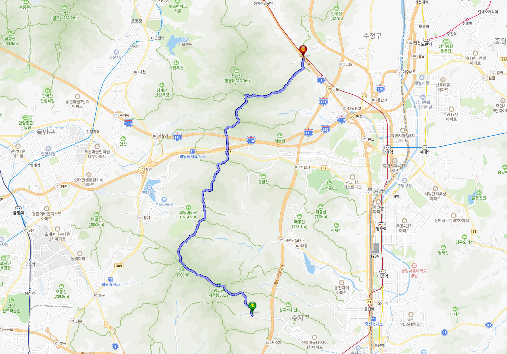 광교산->백운산->바라산->우담산->하오고개->국사봉->이수봉까지 전진했지만,