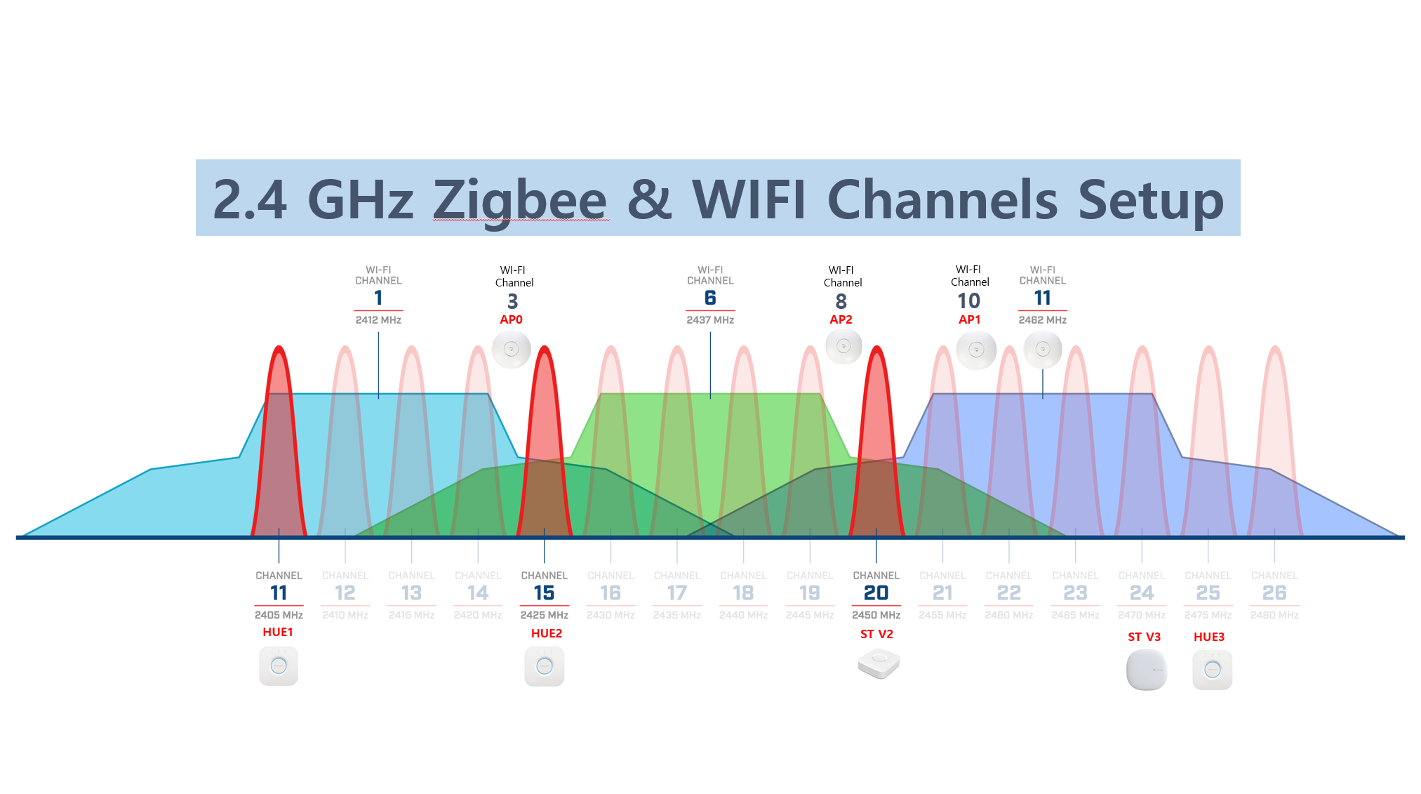 2.4 GHz 채널만 잘 배치해도 간섭(Interference), 누락(Drop), 재시도(Retry)를 줄여서 안정적인 스마트홈 운영이 가능하다.