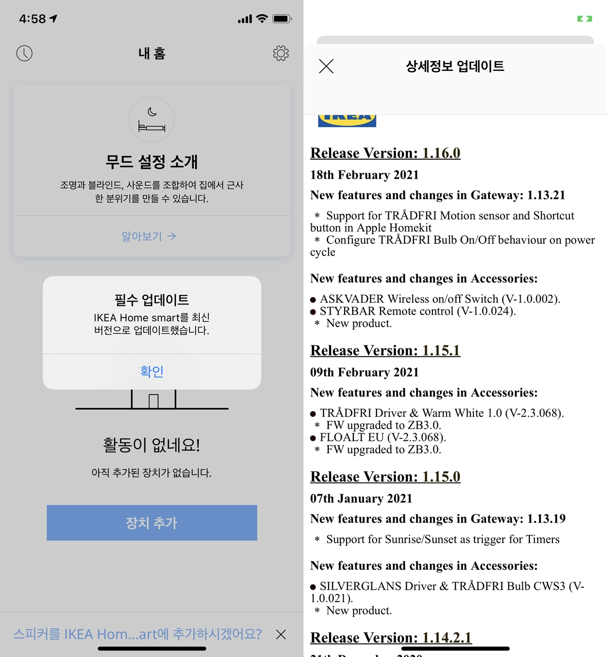 그리고 언제나처럼 이케아 게이트웨이와 디바이스들의 펌웨어를 최신 버전으로 갱신하고,