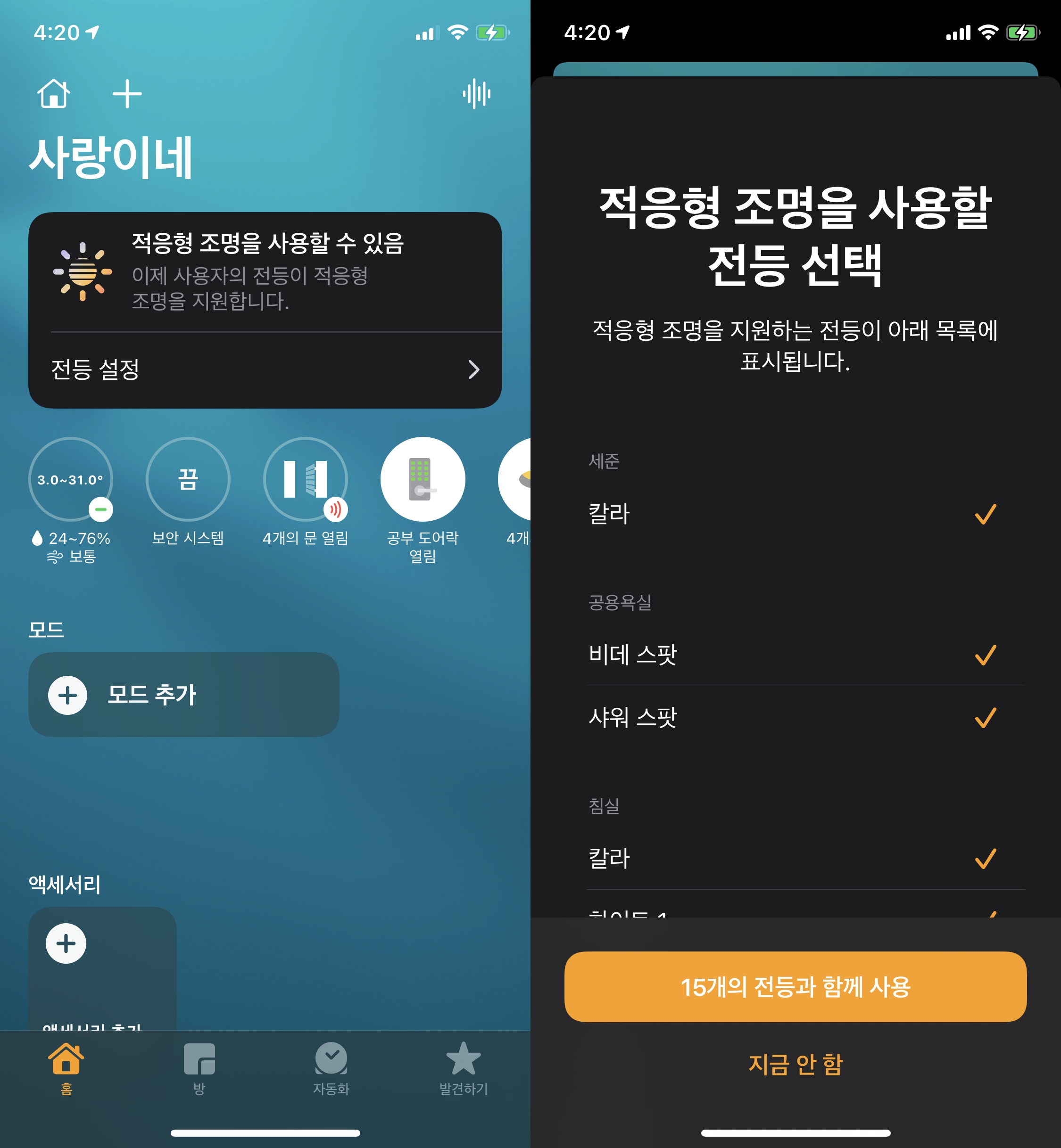 휴 브릿지 펌웨어를 올리면 홈앱에서 적응형 조명 선택 화면이 나오는데,