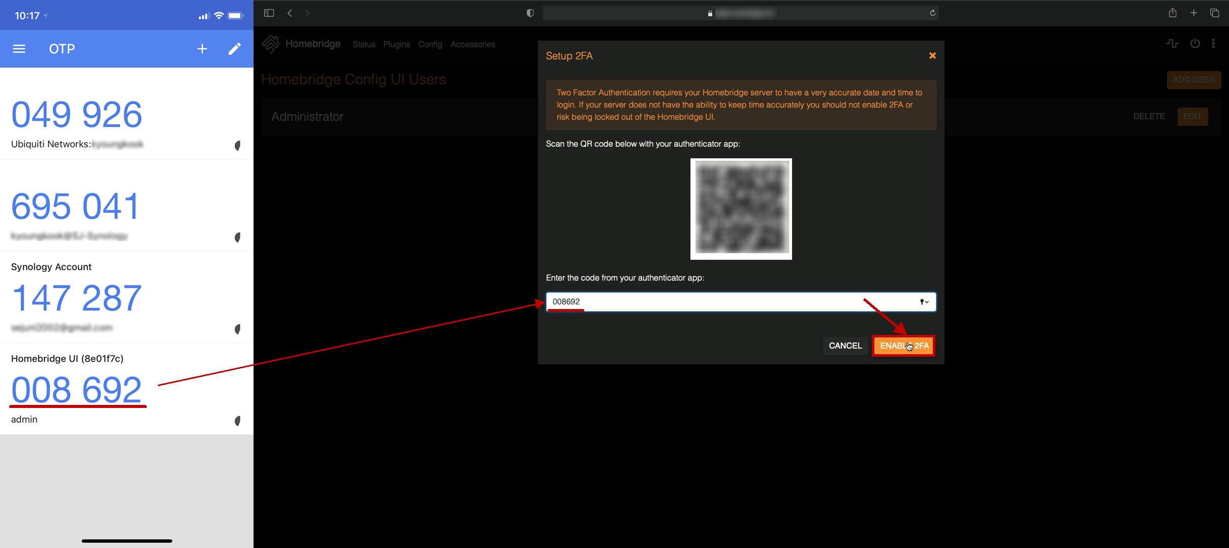 생성된 일회용 암호를 홈브릿지 화면에 넣고 'ENABLE 2FA'를 누르면 활성화가 된다.