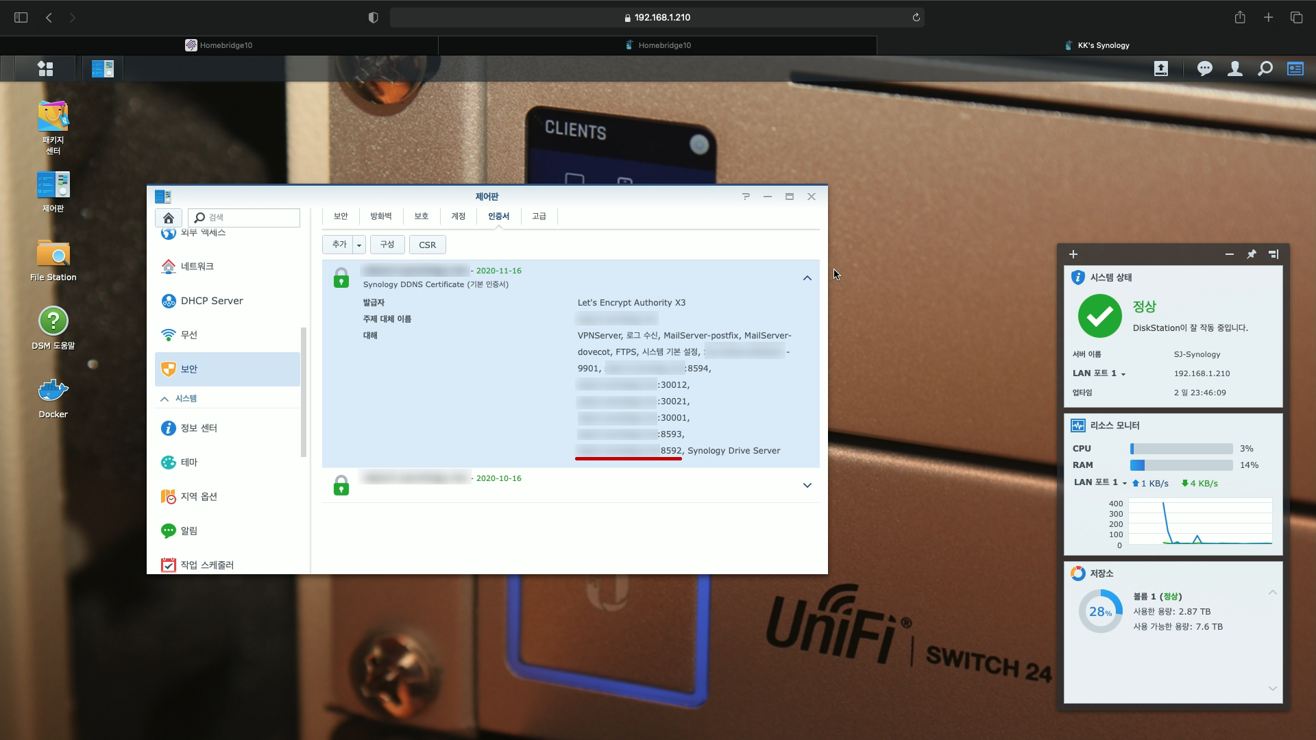 4) 그리고 [제어판-보안-인증서]에 들어가 보면 역방향 프록시 정의가 등록되어 있는 것을 확인할 수가 있다.