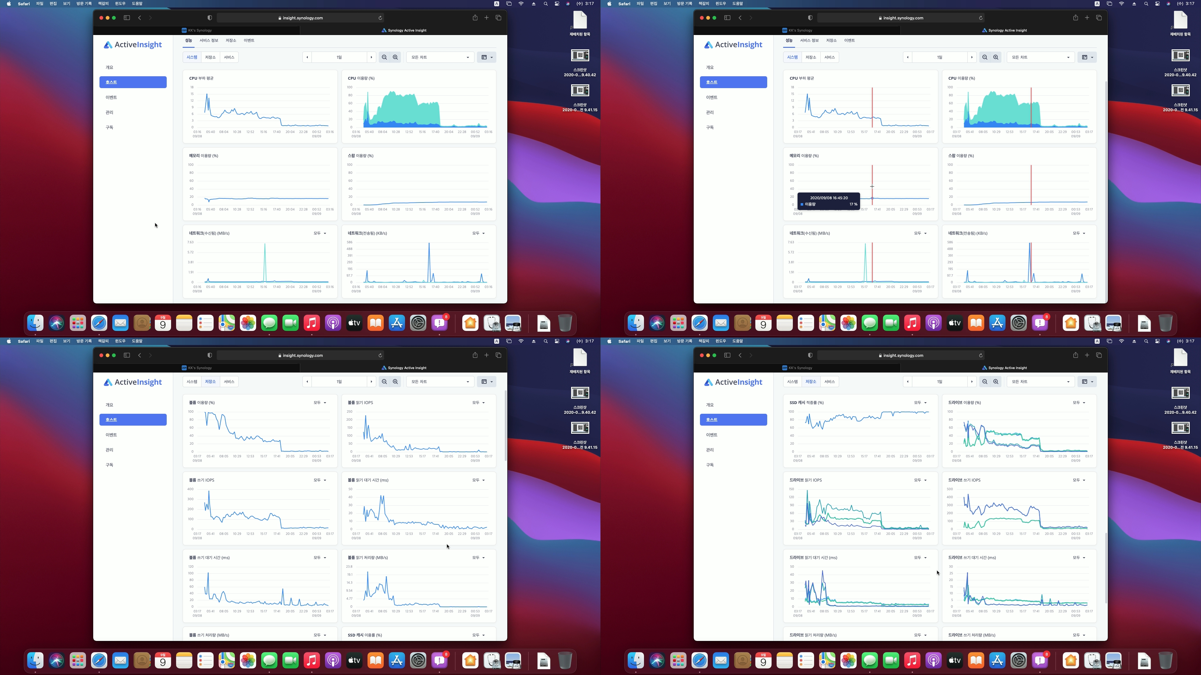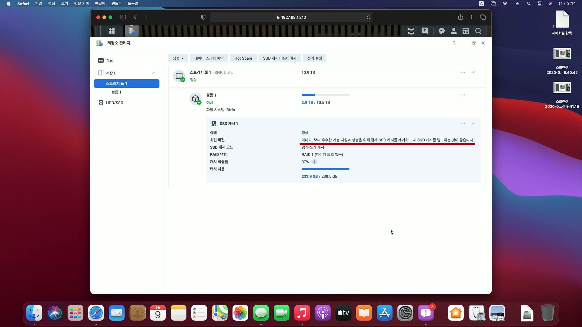 설치를 마치고 로그인을 하자 시스템 상태창에 빨간색으로 SSD 캐시 성능 저하가 표시되었고,