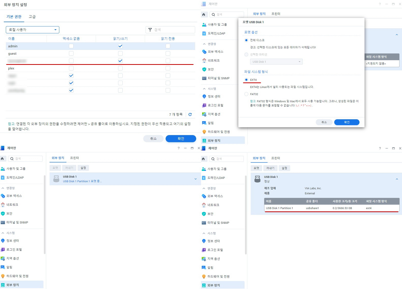 시놀로지 DSM 7.0 제어판의 외부 장치 설정에서 리눅스 ext4 파일 시스템으로 깨끗하게 포맷하고,
