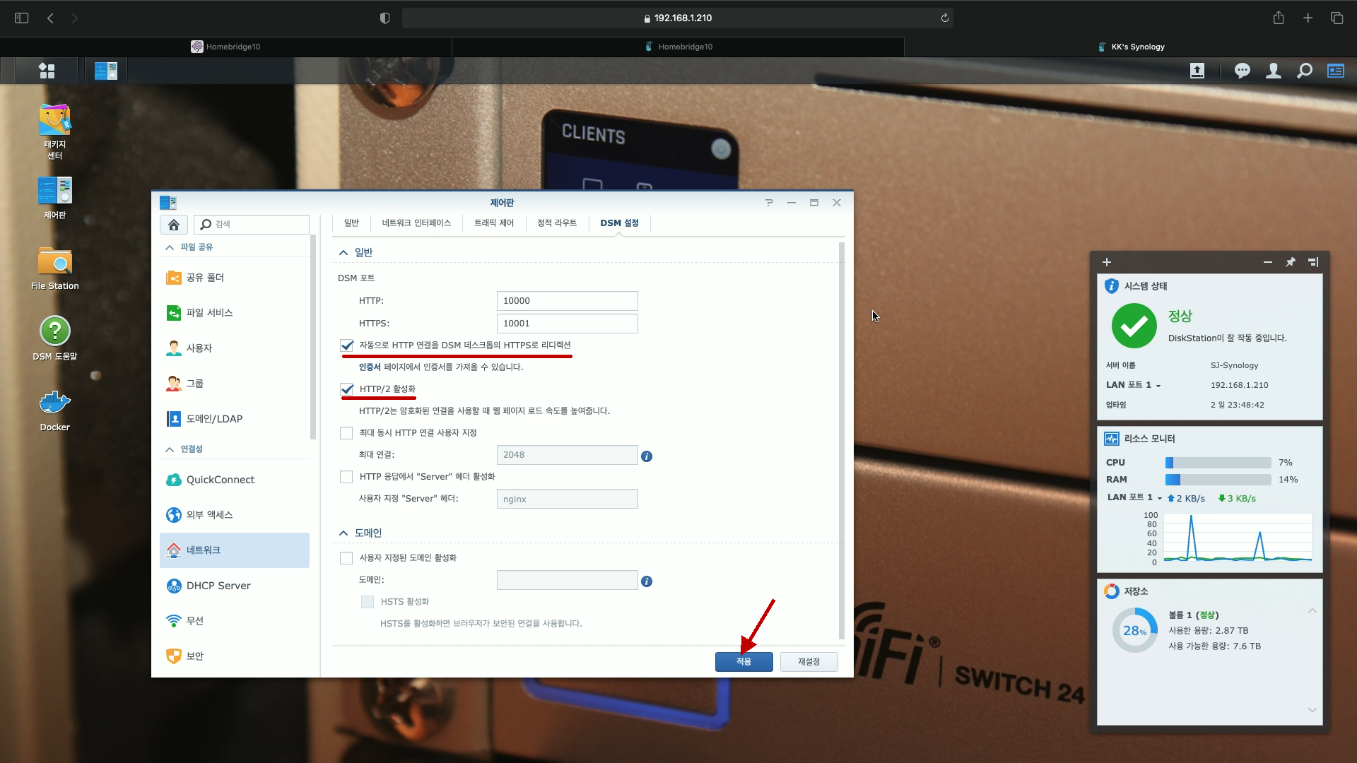 2) [제어판-네트워크-DSM 설정]에서 2곳을 체크하여 '적용'을 누른후,