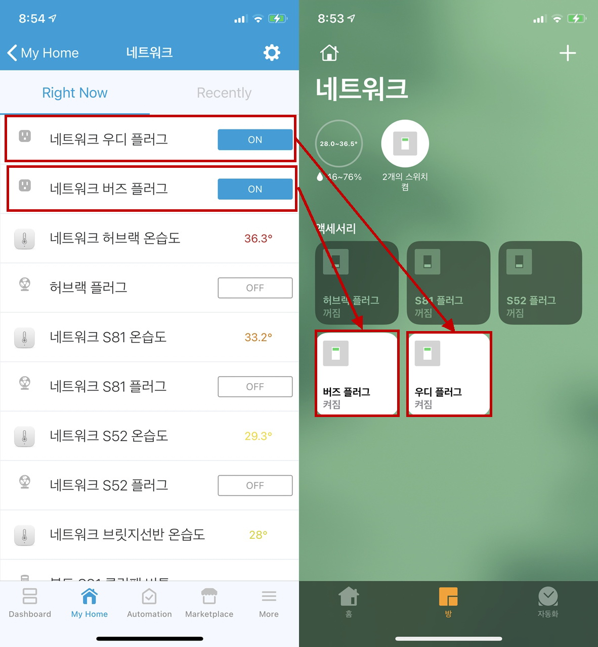 ST앱은 설정시에만 사용하여서 홈브릿지로 스마트홈 통합 어플인 홈앱까지 연동을 시켰다.
