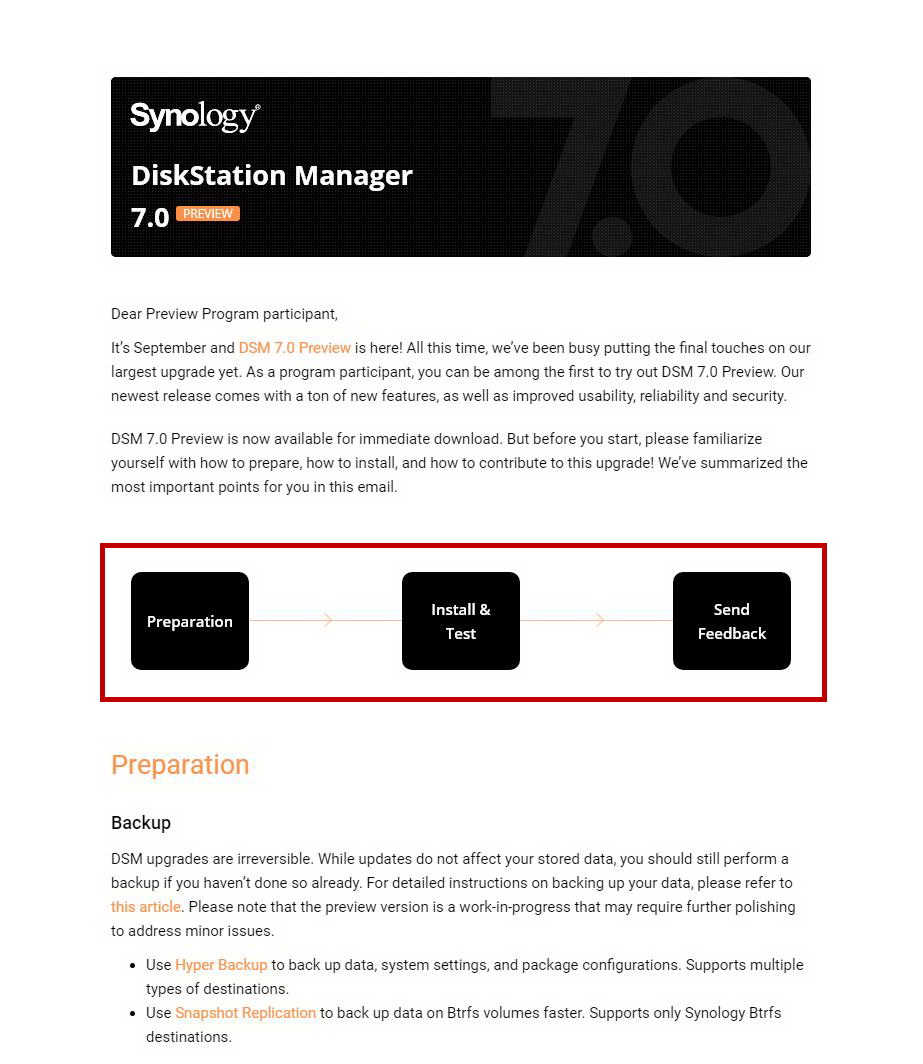 시놀로지팀은 DSM 7.0 Preview 업그레이드에 백업, 설치, 피드백의 3단계 절차를 제안했는데,