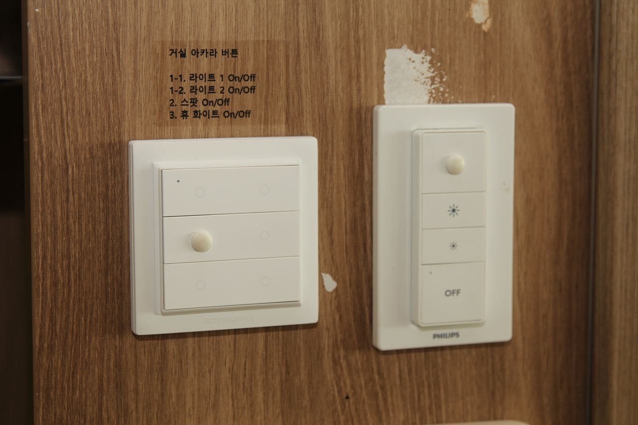 아카라 벽 스위치 덕분에 5년 만에 천장등을 반반씩 켤 수 있게 되었으며, 반응 속도도 매우 빠르고 디자인도 밉상이 아니어서,