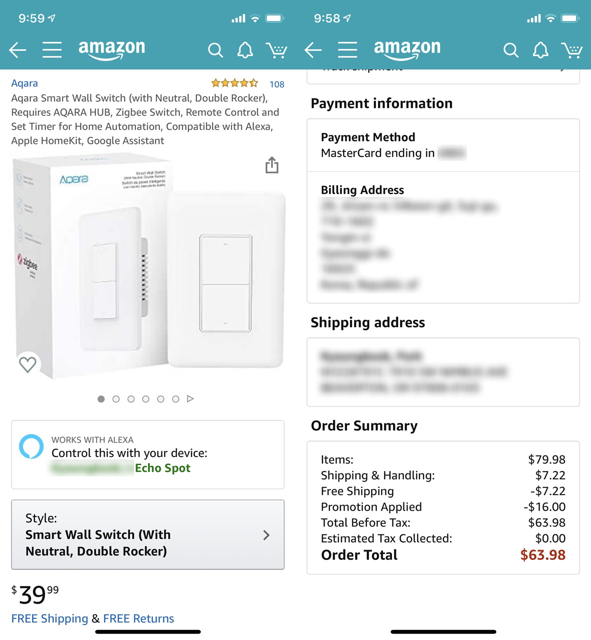 미국 아마존에서 출시하던 날에 20% 할인코드를 적용하여 63.98 달러에 2개를 구매하였다.