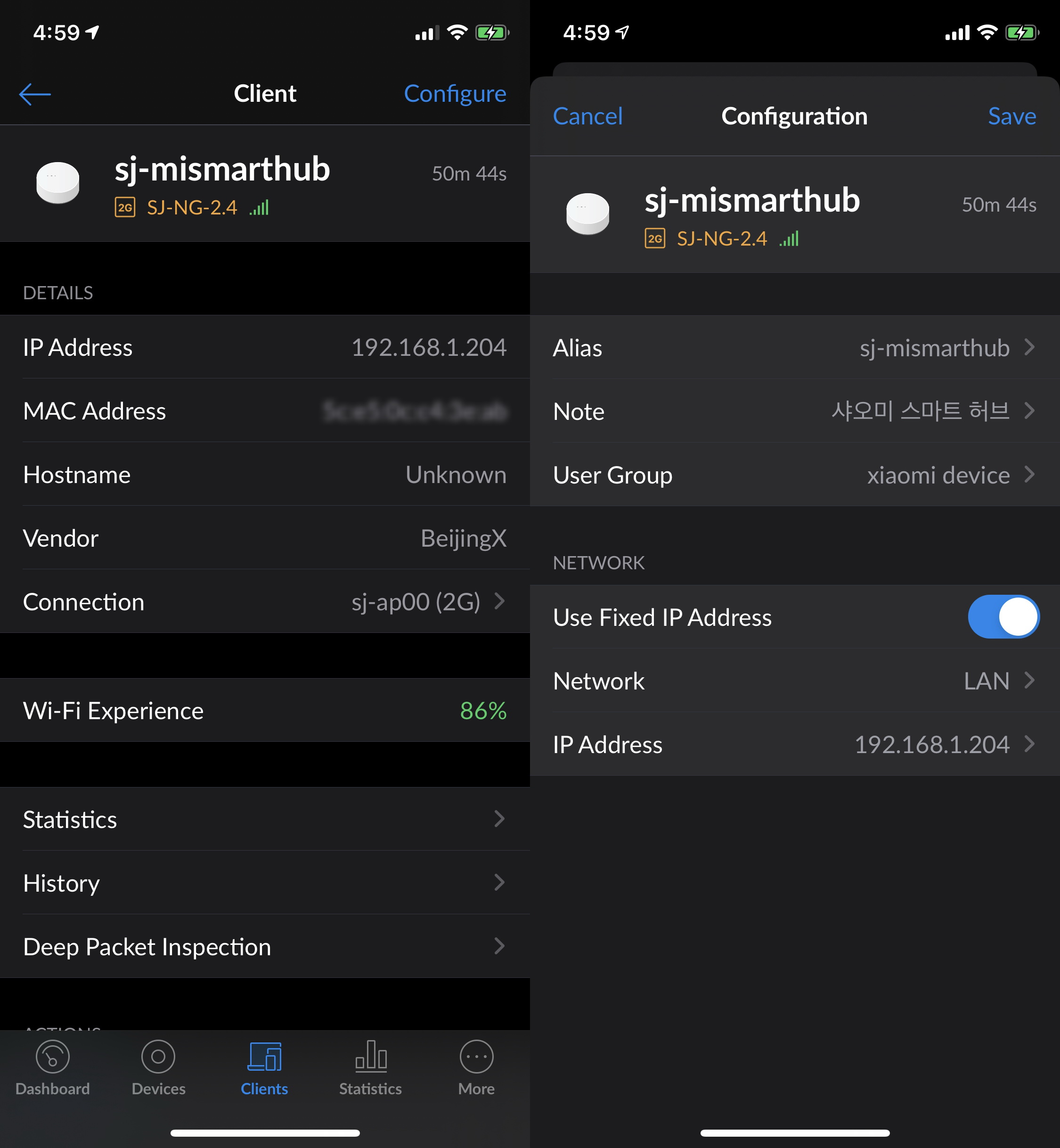3.4) 클라이언트 리스트에서 Unifi Presence Sensor로 사용할 스마트폰을 선택하고 저장하면 설치는 모두 끝난다.