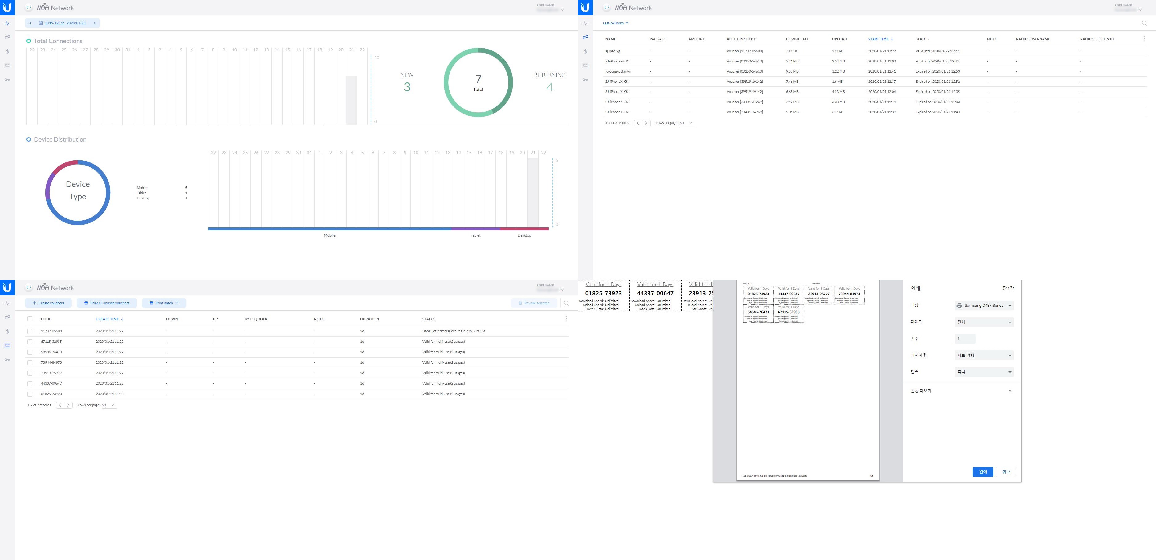마지막으로 게스트 포탈에는 게스트 접속 통계, 접속 이력, 과금 관리, 쿠폰(Vaucher) 관리등의 화면이 있었다.