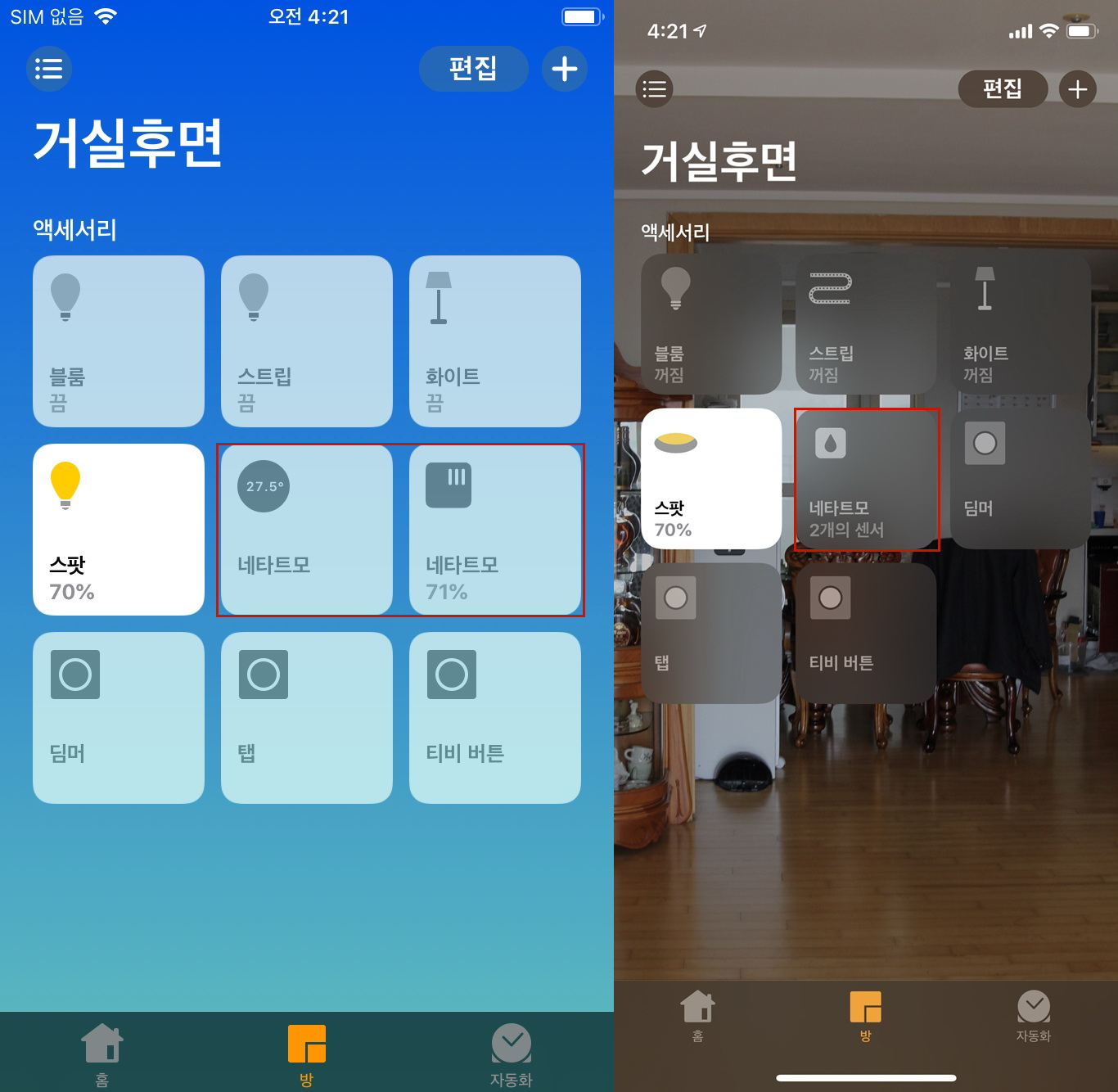 iOS 13의 오리지널 홈앱처럼 센서를 하나의 타일로 모아서 보여 주었으나,