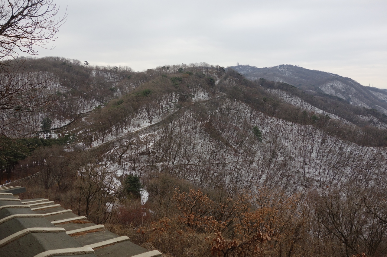 뒤돌아 검단산 방향을 바라보자 눈 덮인 산성이 너무 아름답더라.