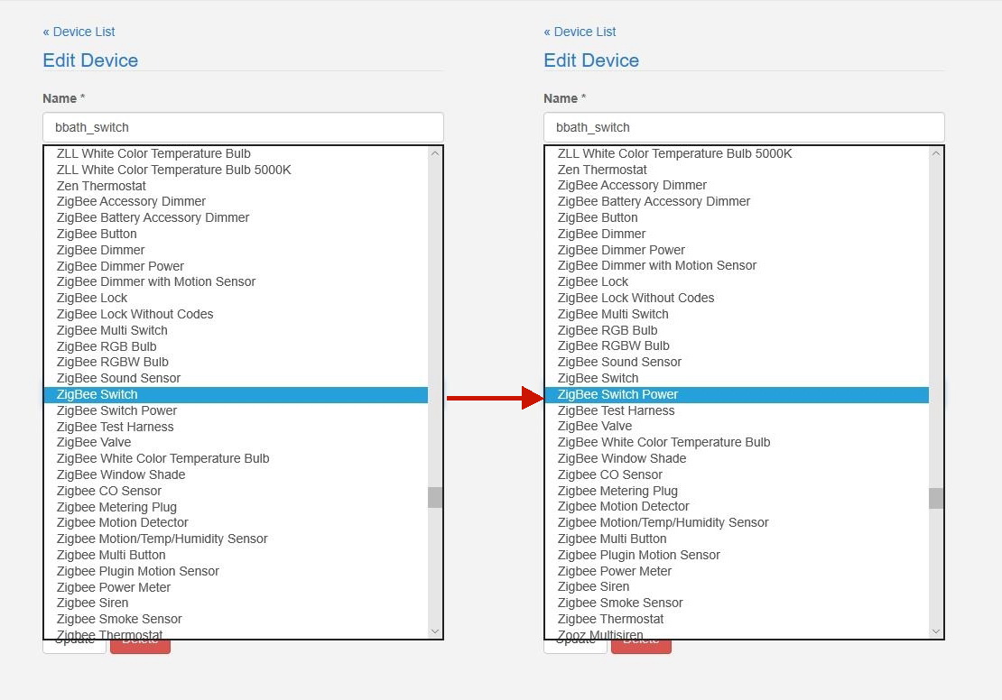 디바이스 타입을 'Zigbee Switch Power'로 바꾸어만 주면,