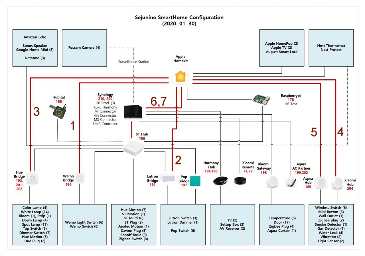 6) 홈 브릿지 (44개 액세서리) : ST 허브와 연동하는 도커 브릿지. 초기엔 불안정 하였으나 현재는 안정적