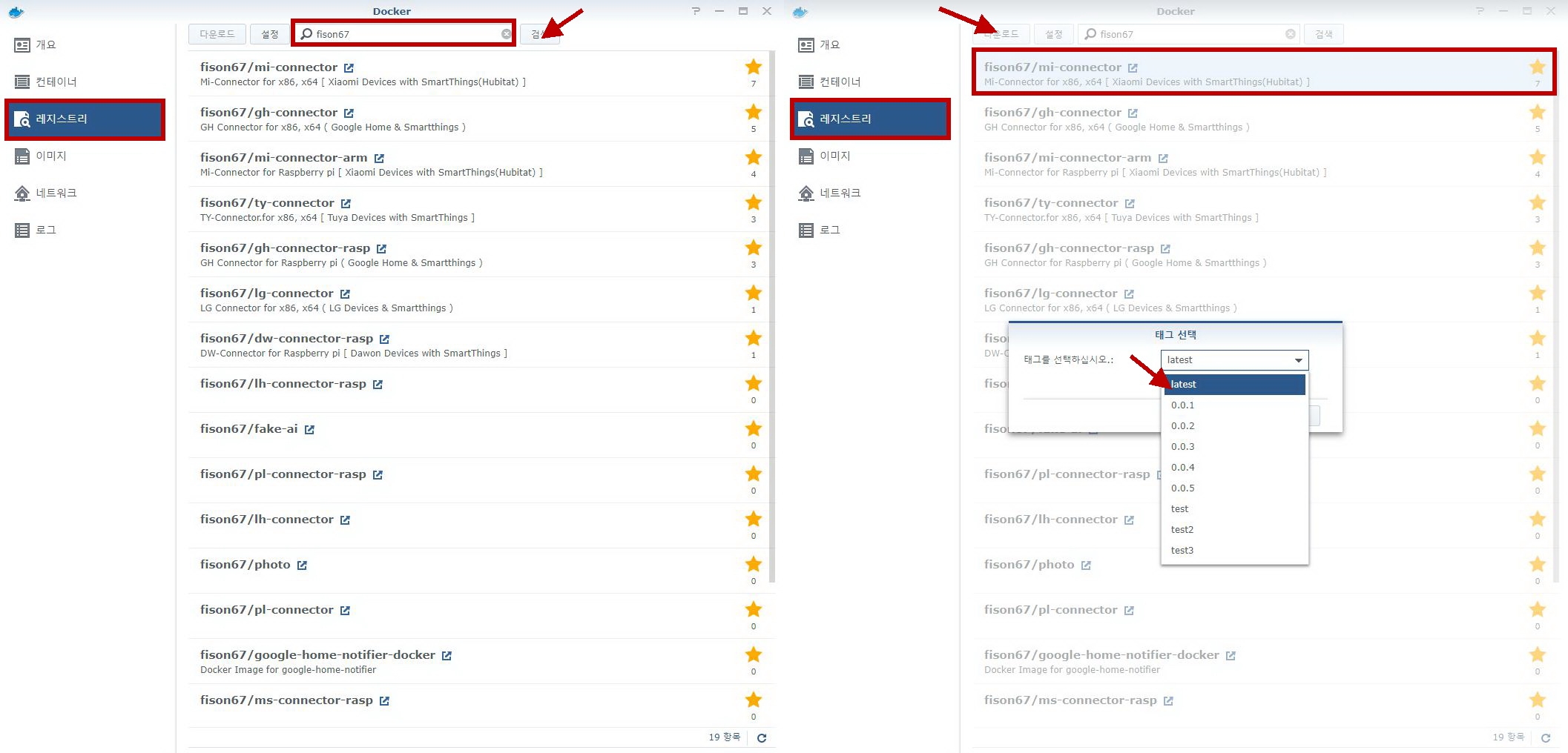 다시 시놀로지 도커로 돌아와서 레지스트리 메뉴의 검색창에 'fison67' 입력후 검색하고,